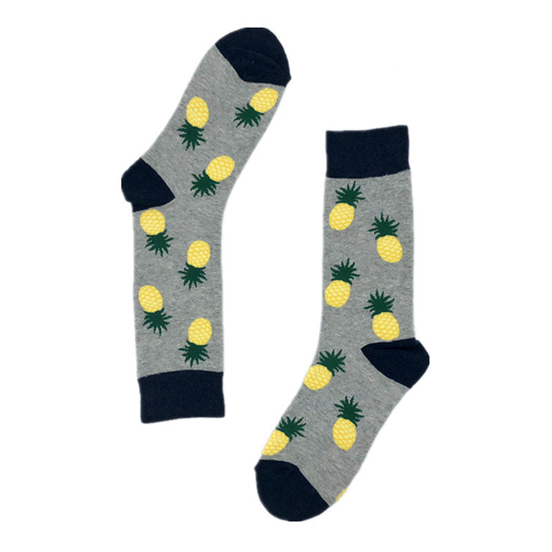 Grå sokker med blå detaljer på hælen, ytterst på sokken, og øverst på kanten av sokken. Disse sokkene har motiv av ananas.