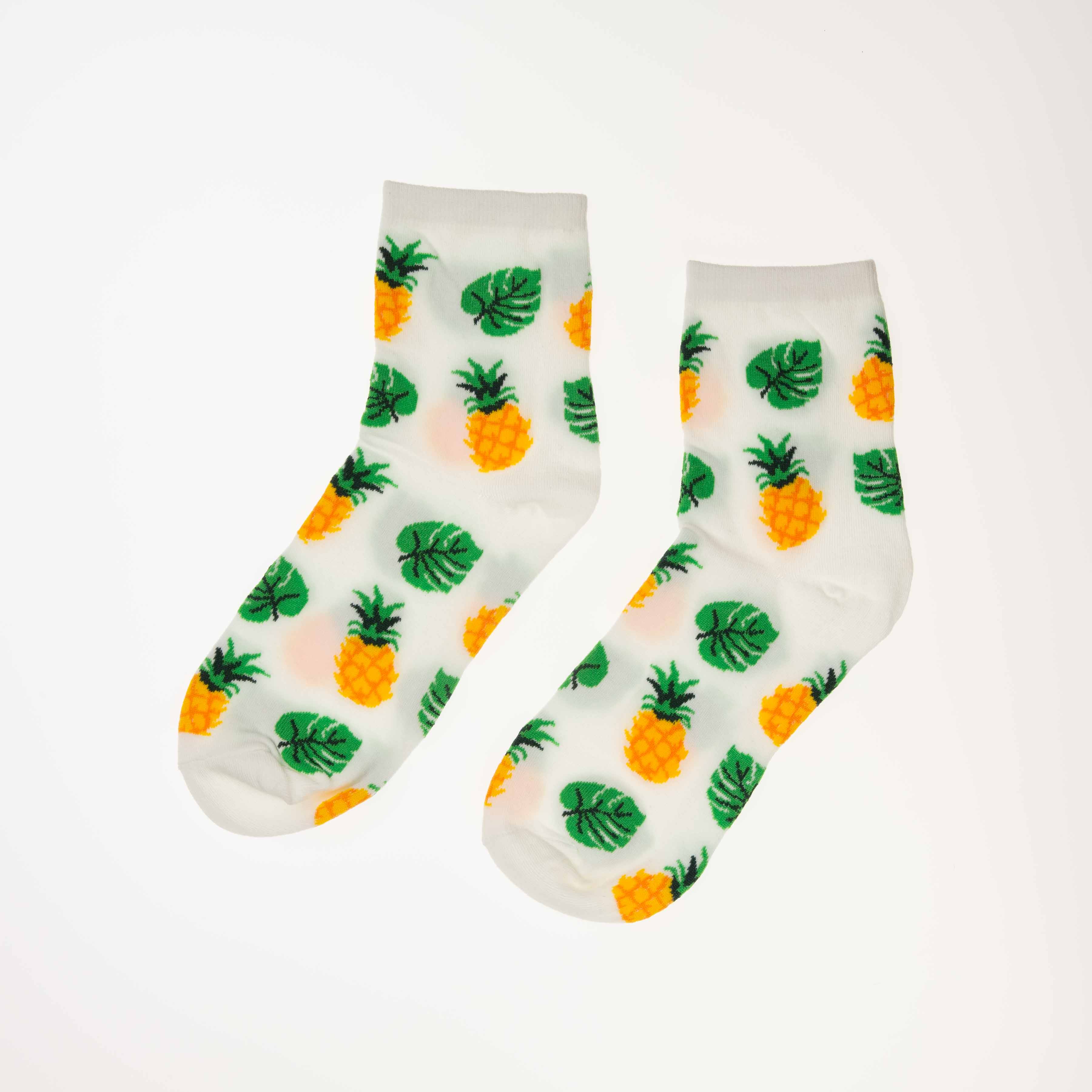 Hvite sokker med motiv av ananas. Sokkene er myke og behagelige, og passer til enhver anledning.