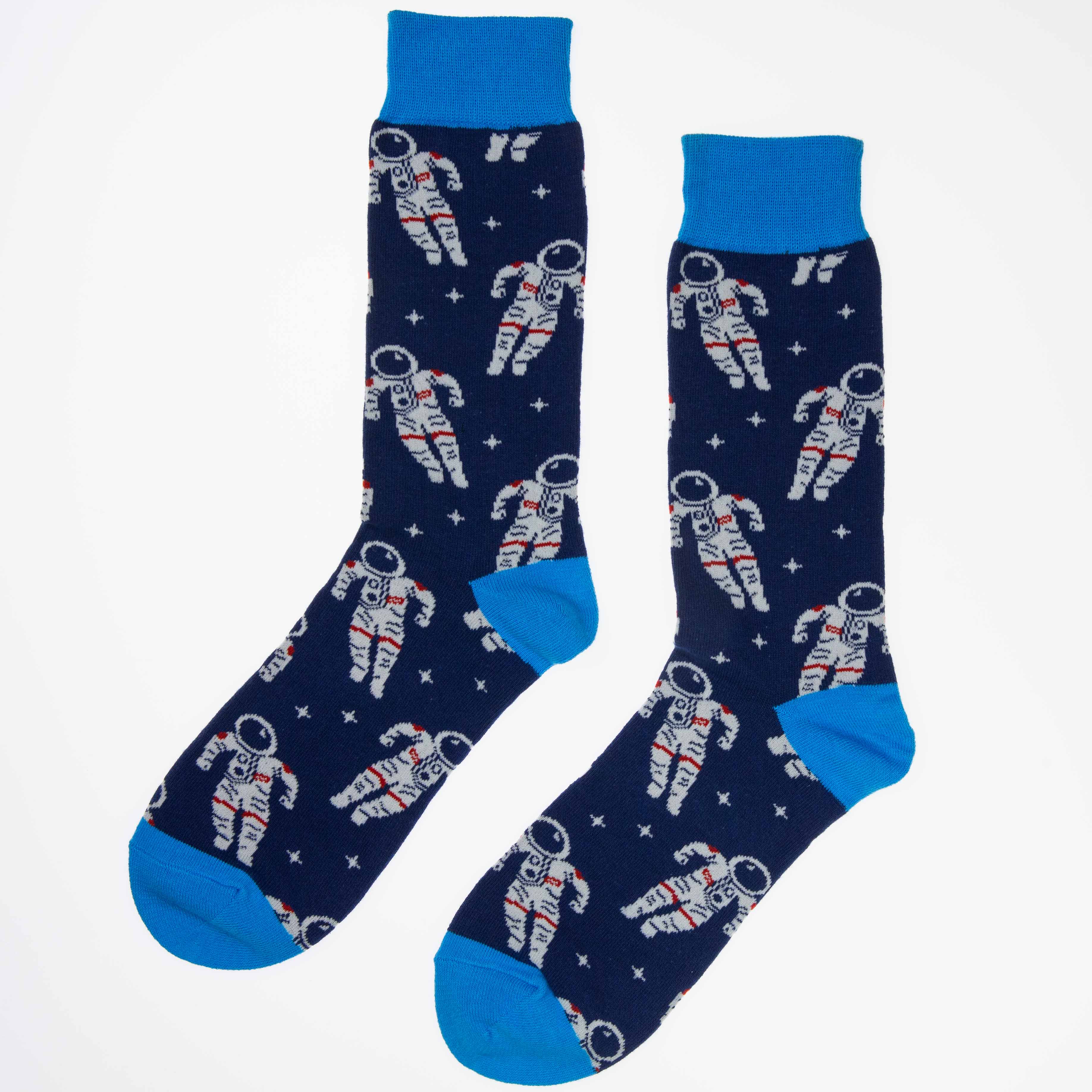 Blå sokker med motiv av astronaut. Sokkene er myke og behagelige, og passer til enhver anledning.