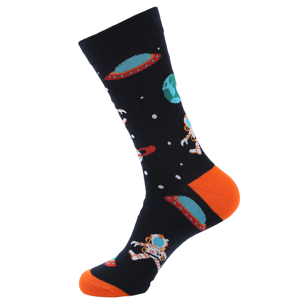 Svarte sokker med motiv av astronauter og romskip. Sokkene er myke og behagelige, og passer til enhver anledning.