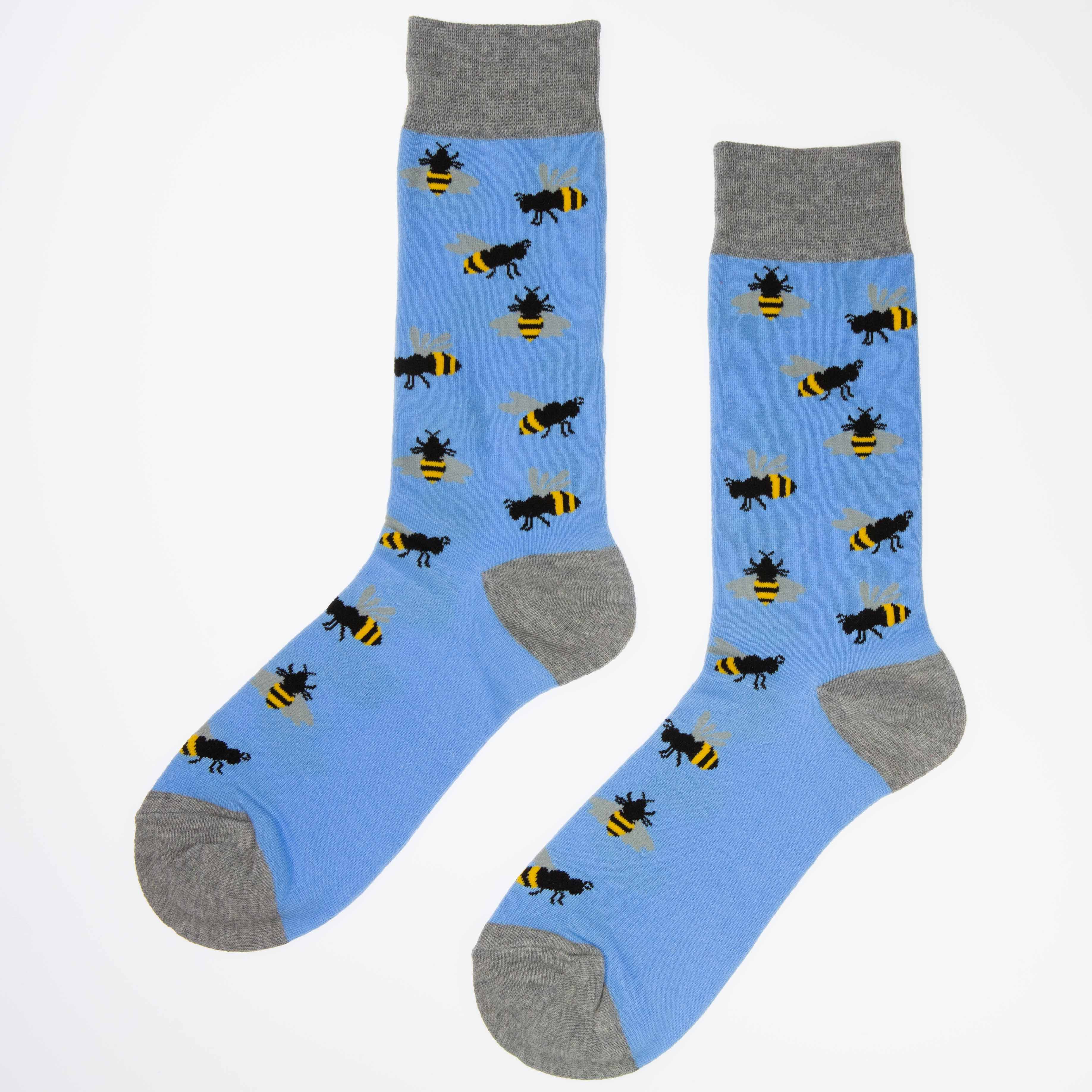 Lyseblå og grå sokker med motiv av bier. Sokkene er myke og behagelige, og passer til enhver anledning.