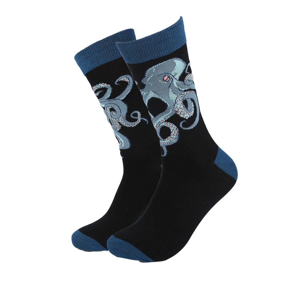 Svarte og blå sokker med motiv av en blekksprut. Sokkene er myke og behagelige, og passer til enhver anledning.