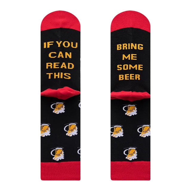 Morsomme sokker med tekst under foten. "If you can read this, bring me some beer". Skap latter i hverdagen og få andre til å hente ting til deg mens du ligger på sofaen og slapper av!