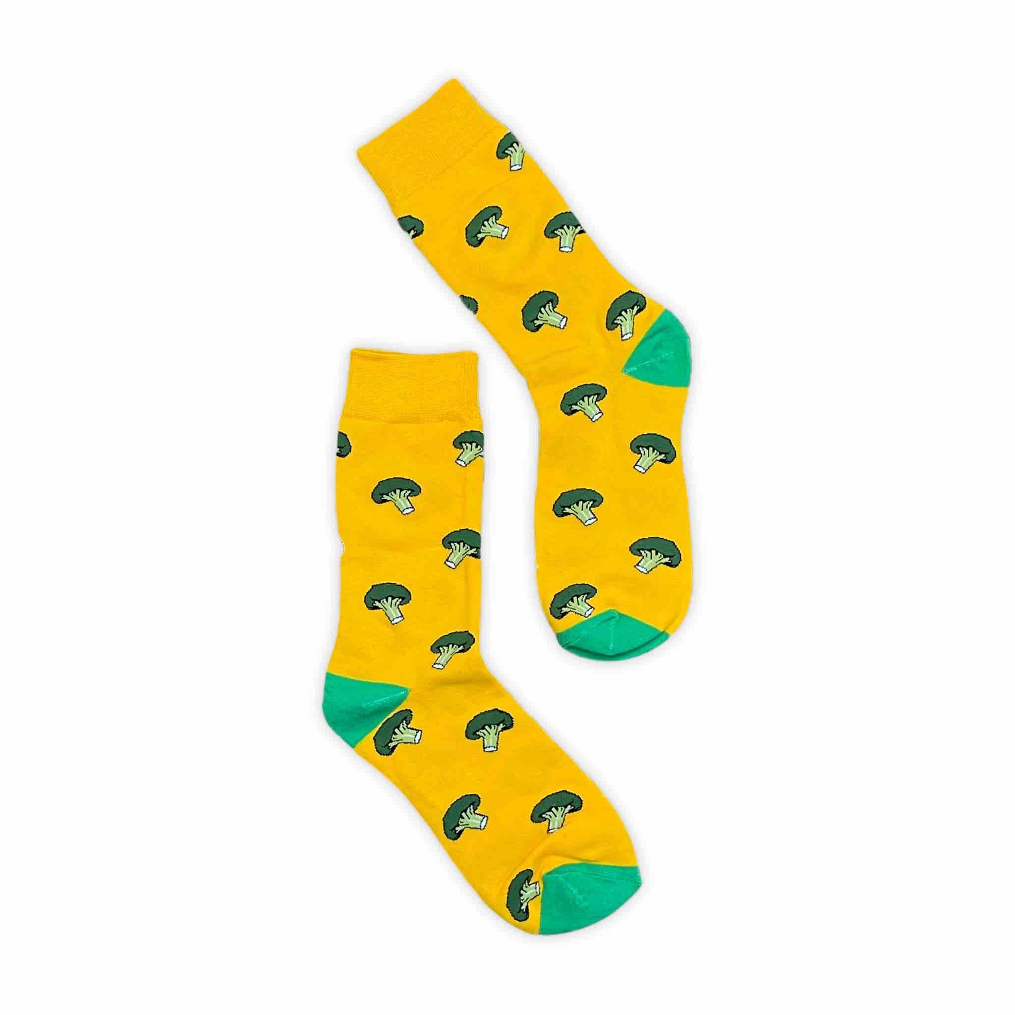 Gule sokker med motiv av brokkoli. Sokkene er myke og behagelige, og passer til enhver anledning.