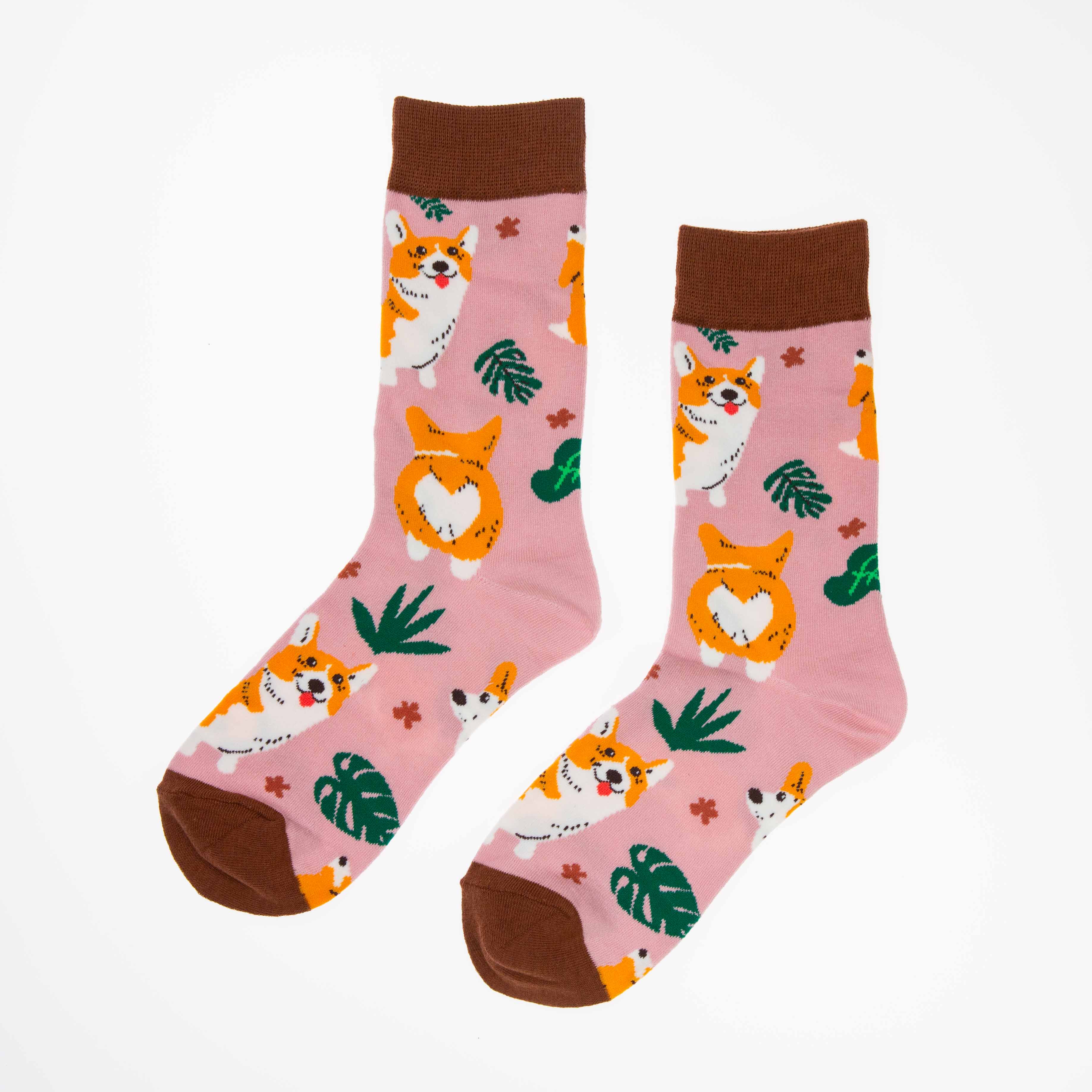 Rosa sokker med motiv av Corgier og planter. Sokkene er myke og behagelige, og passer til enhver anledning.