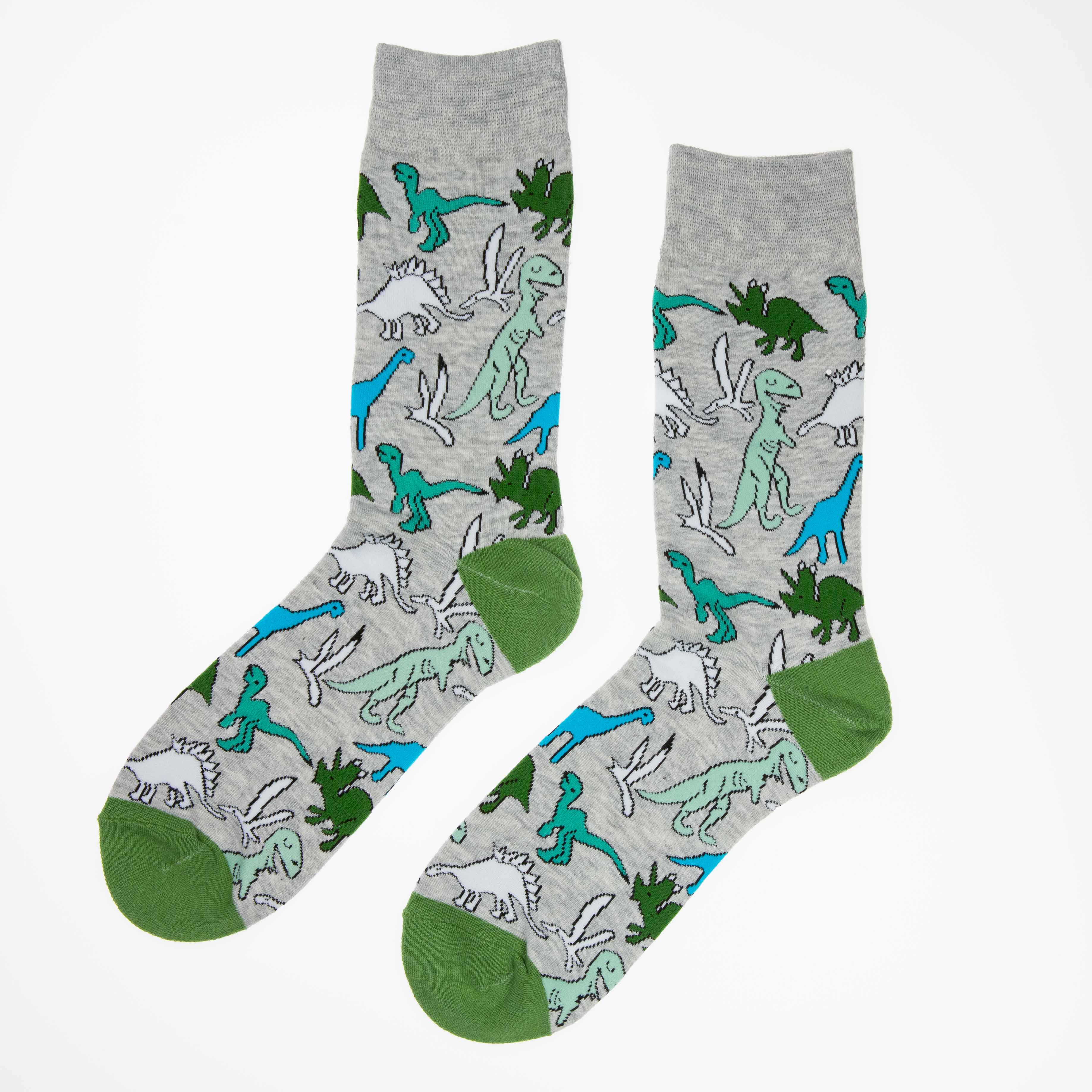 Lysegrå sokker med motiv av dinosaurer. Sokkene er myke og behagelige, og passer til enhver anledning.