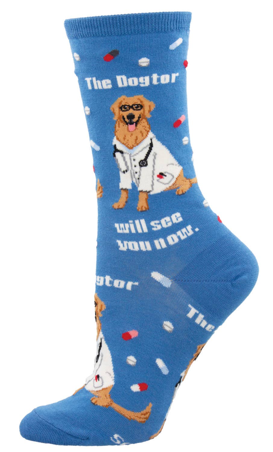 Blå, komfortable sokker med doktor-hunder og morsomme detaljer, like digge til lange dager på jobb som til rolig sofakos hjemme.