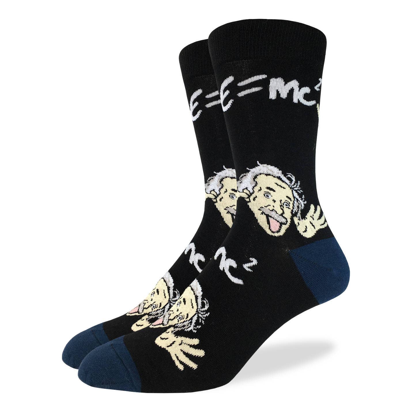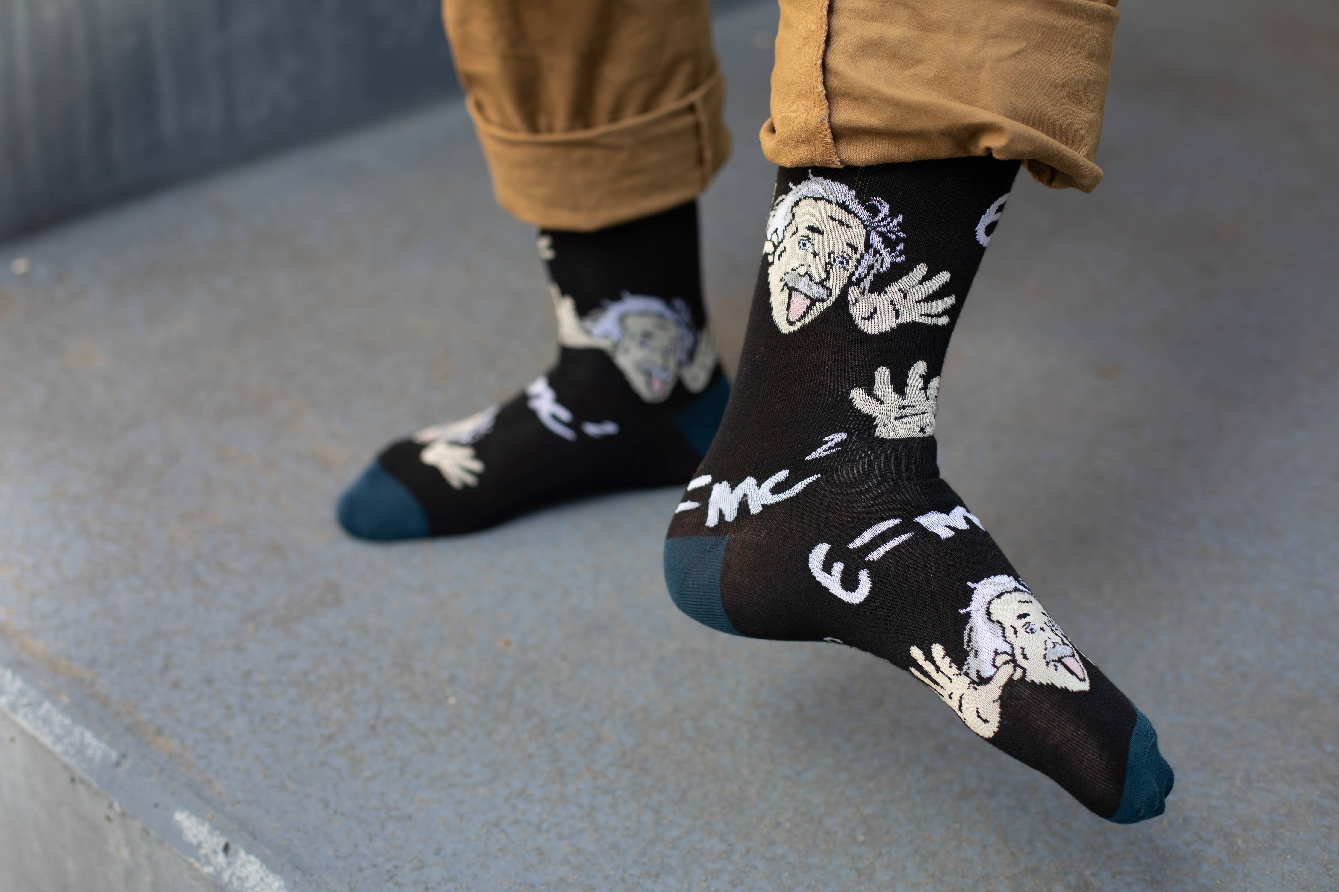 Disse svarte sokkene viser Albert Einstein fra en litt mer useriøs side, der han geiper og tuller i kjent stil. Perfekte sokker for deg som liker å blande smart og sprøtt, og som vet at selv genier må ha det litt gøy. Et par sokker som garantert vekker oppmerksomhet og et smil!