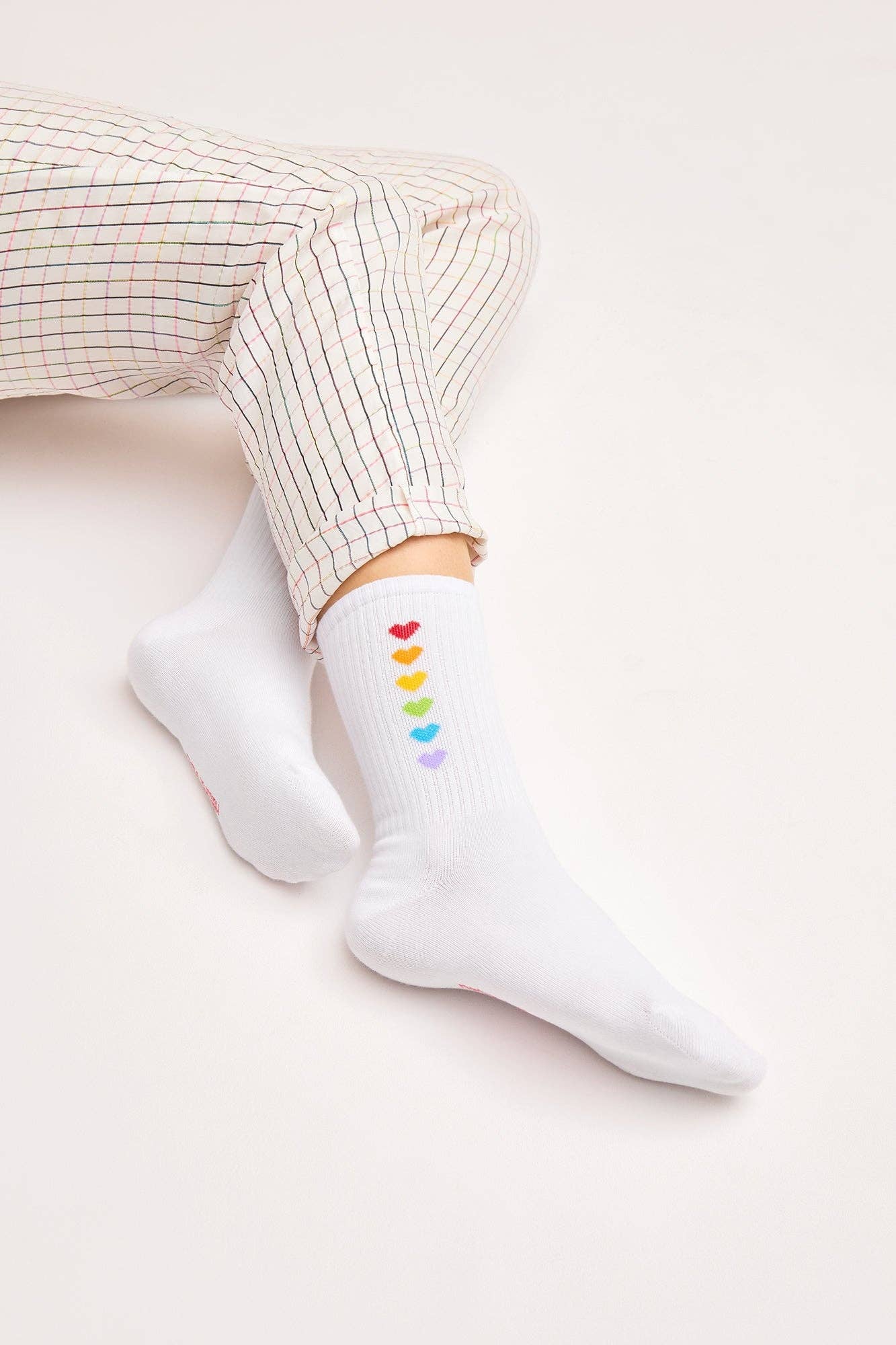 Natural Vibes crew-sokker i myk, økologisk bomull har et hjerte for både komfort og kjærlighet. De hvite sokkene er dekorert med små hjerter i regnbuens farger – perfekte til Pride-paraden, men også like fine til søndagsturen. Et fargerikt og varmt innslag i hverdagen, året rundt.