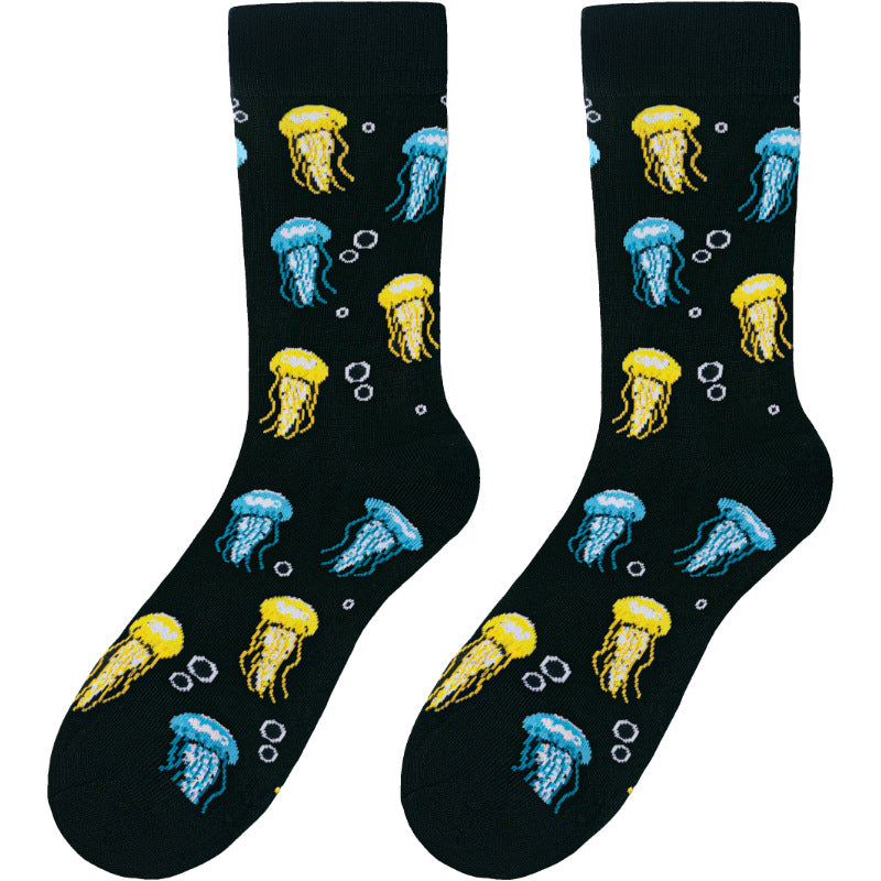 De gule og blå manetene danser over sokken som små undervanns-disco-lamper, og boblene rundt gjør hele paret ekstra levende. Myke, stretchy og klare til å gjøre føttene dine til det mest fascinerende i rommet (ja, selv på kontoret).