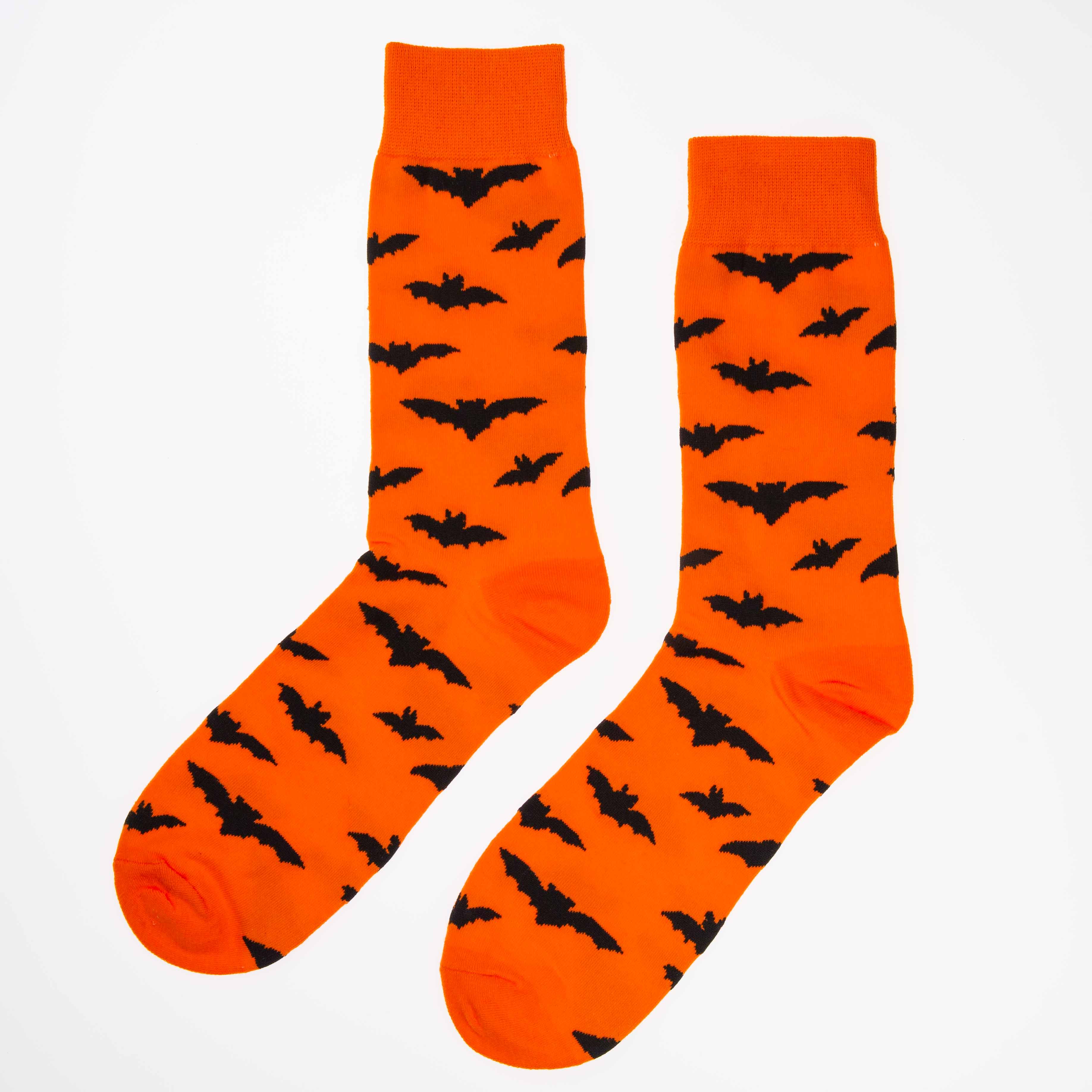 Oransje sokker med motiv av flaggermus. Sokkene er myke og behagelige, og passer til enhver anledning.