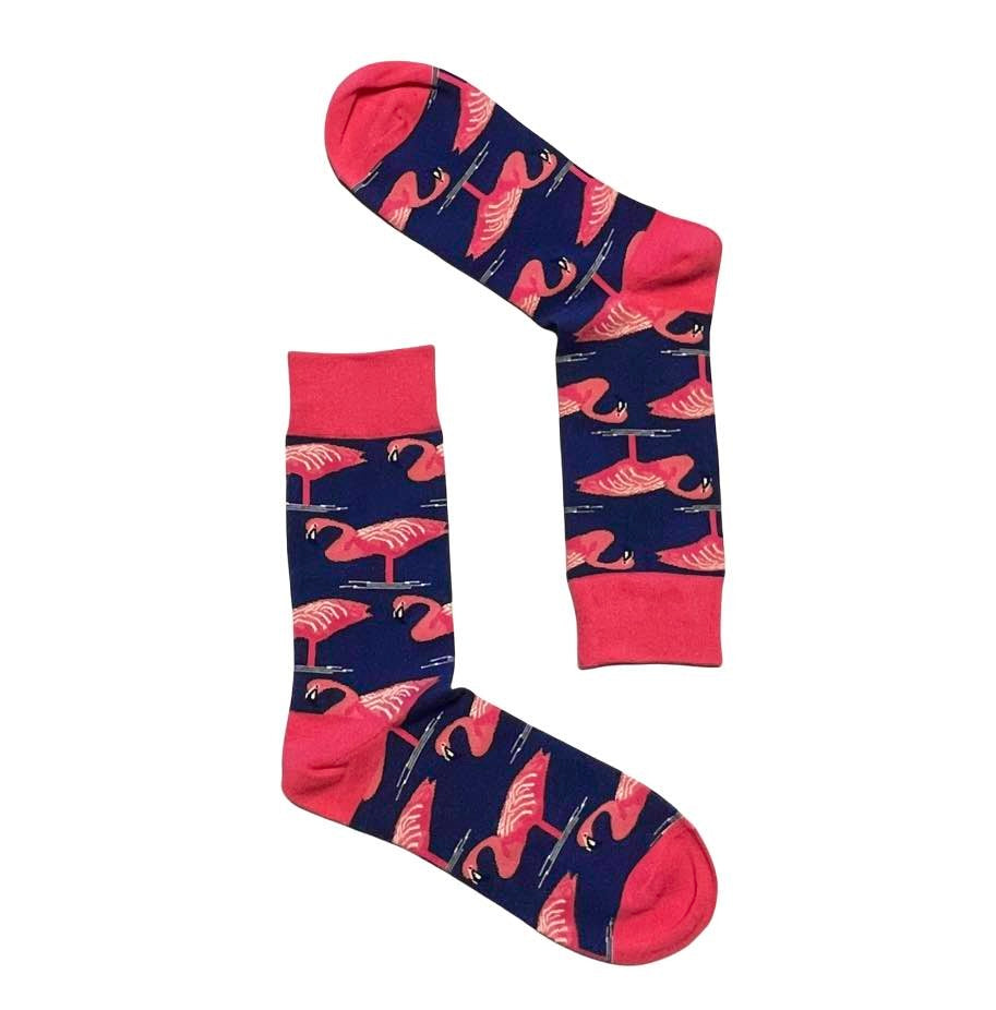 Mørkeblå og rosa sokker med motiv av flamingoer. Sokkene er myke og behagelige, og passer til enhver anledning.