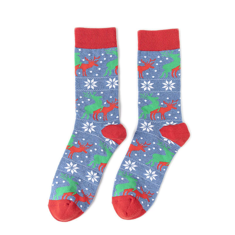 Blå sokker med rød detaljer ytterst på sokken, på hælen, og øverst på kanten av sokken. Disse sokkene har motiv av noen reinsdyr som tar seg til rette.