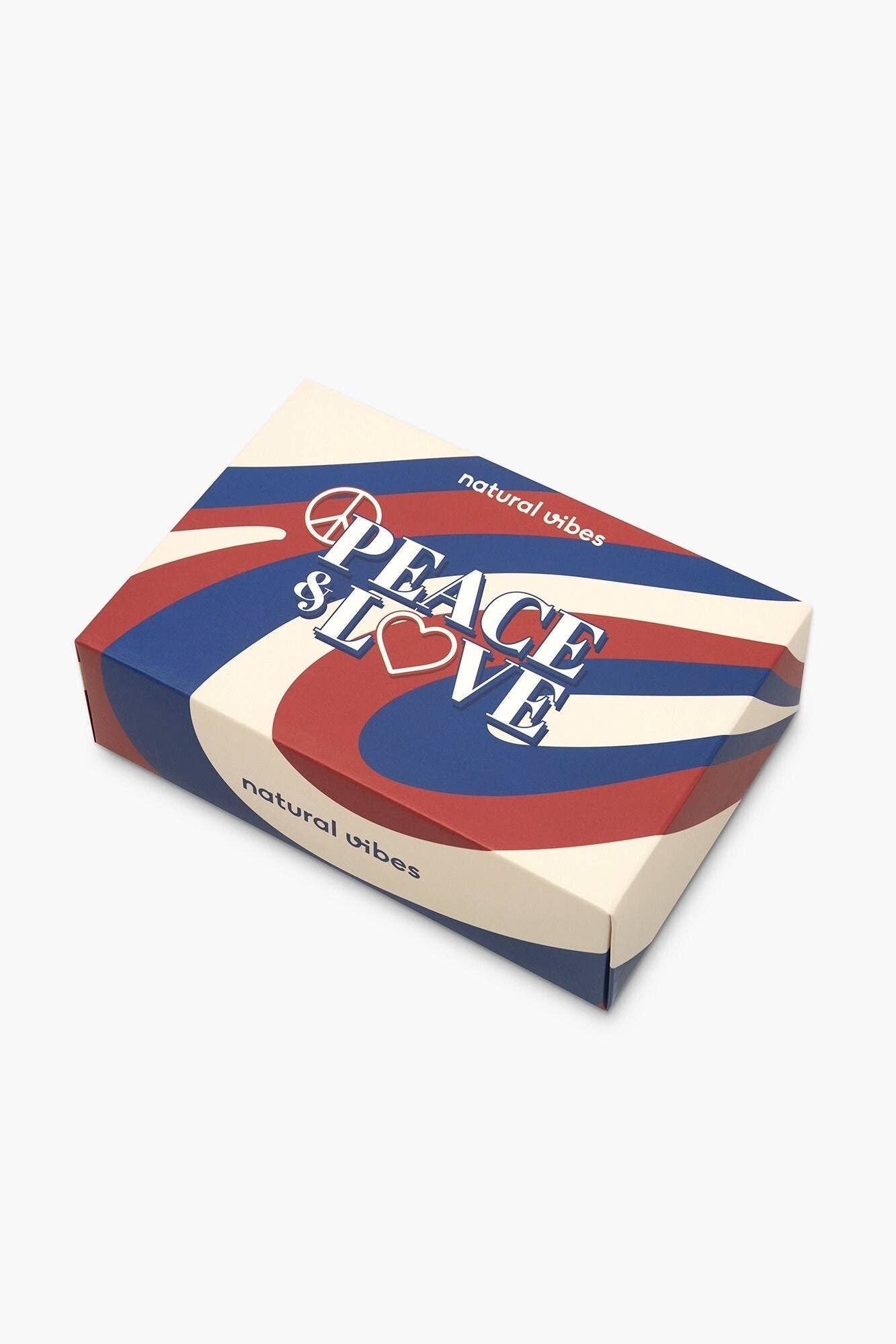 Gi en gave full av gode vibber med denne fine gaveboksen som inneholder to par sokker med peace&love-tema. Perfekt for den som liker farger, positive budskap og komfort i hverdagen! Begge parene er hvite med røde og blå detaljer, men det ene paret har et brodert peace-tegn, og det andre paret har et brodert hjerte.