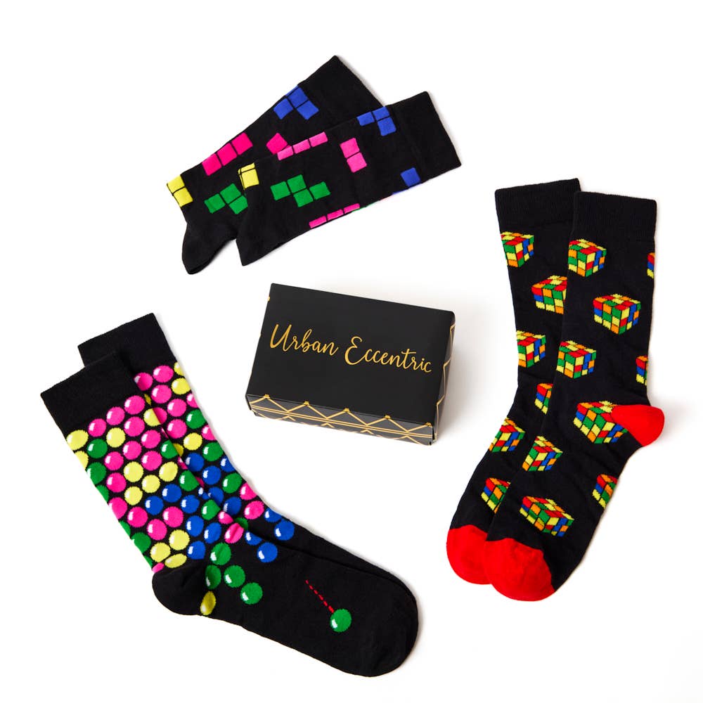 Perfekt pakket inn i en gaveboks, får du tre par freshe retrosokker som holder føttene både varme og festklare. Det ene paret er svarte med motiv av spillet bubble shooter. Det andre paret er også svarte med motiv av Tetris spillet. Det tredje paret har motiv av Rubiks kube, og de er svarte med rød detaljer ytterst på sokken og på hælen.