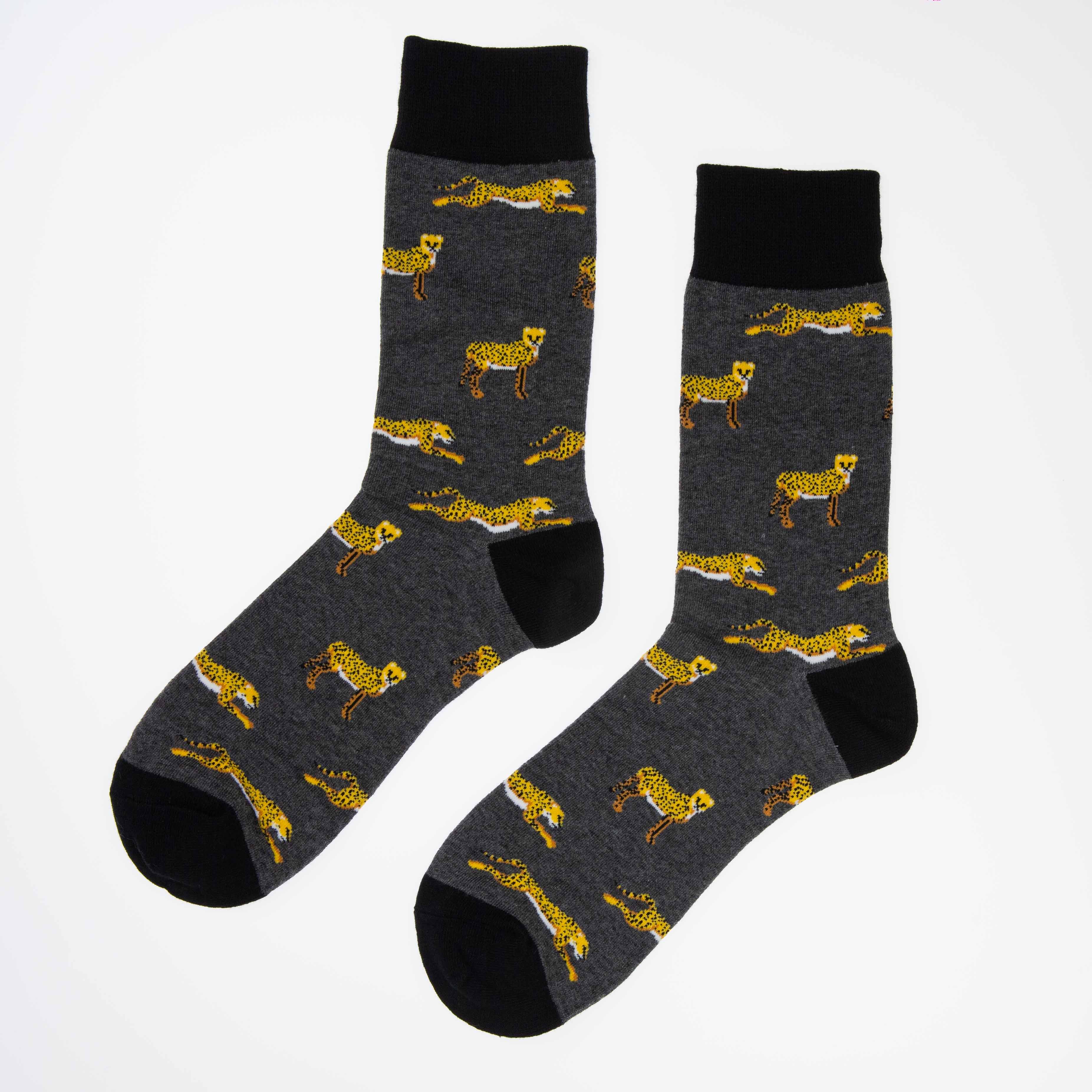 Mørkegrå sokker med motiv av en gepard. Sokkene er myke og behagelige, og passer til enhver anledning.