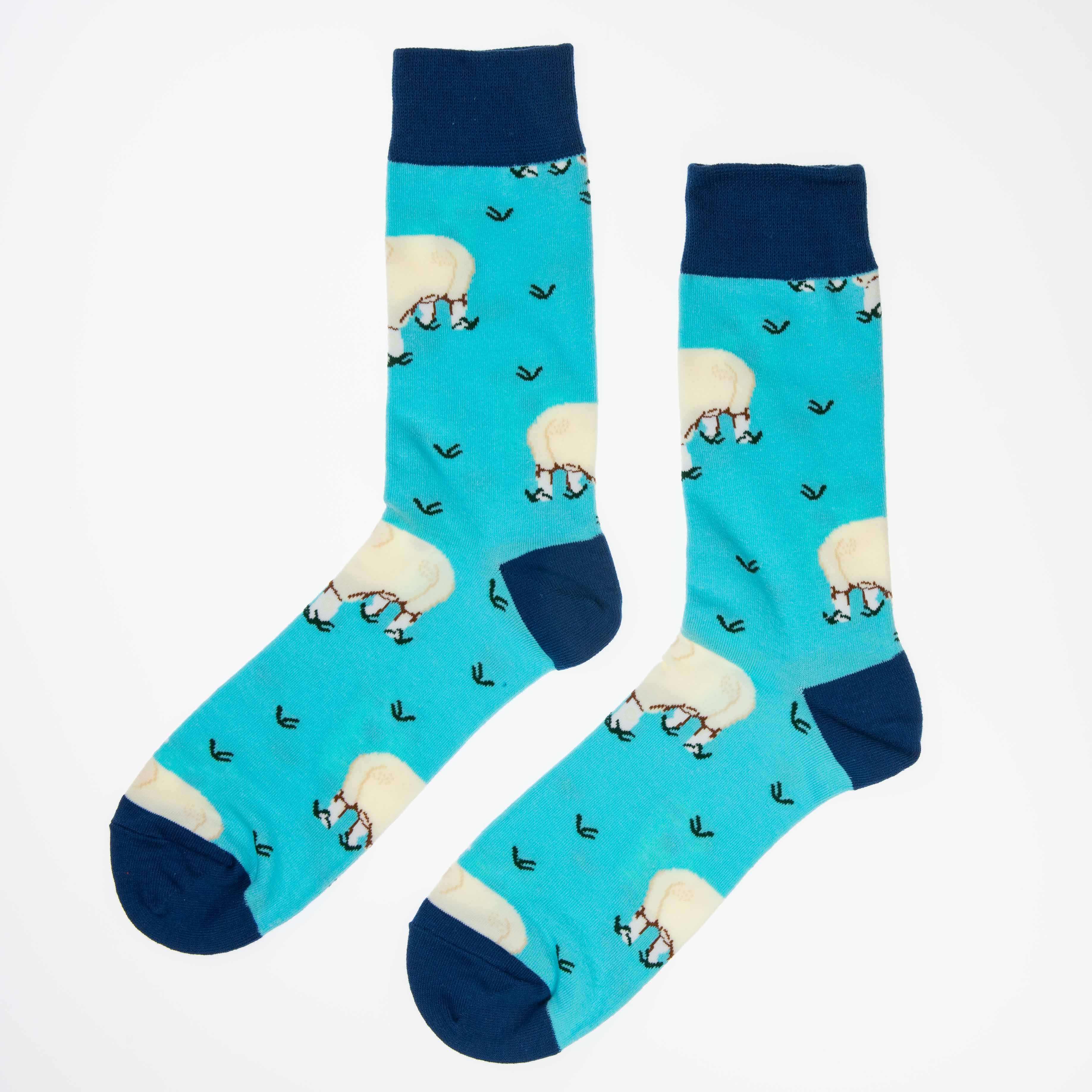 Turkise sokker med motiv av en sau. Sokkene er myke og behagelige, og passer til enhver anledning.