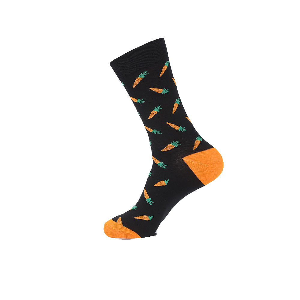 Svarte sokker med motiv av gulrøtter. Sokkene er myke og behagelige, og passer til enhver anledning.