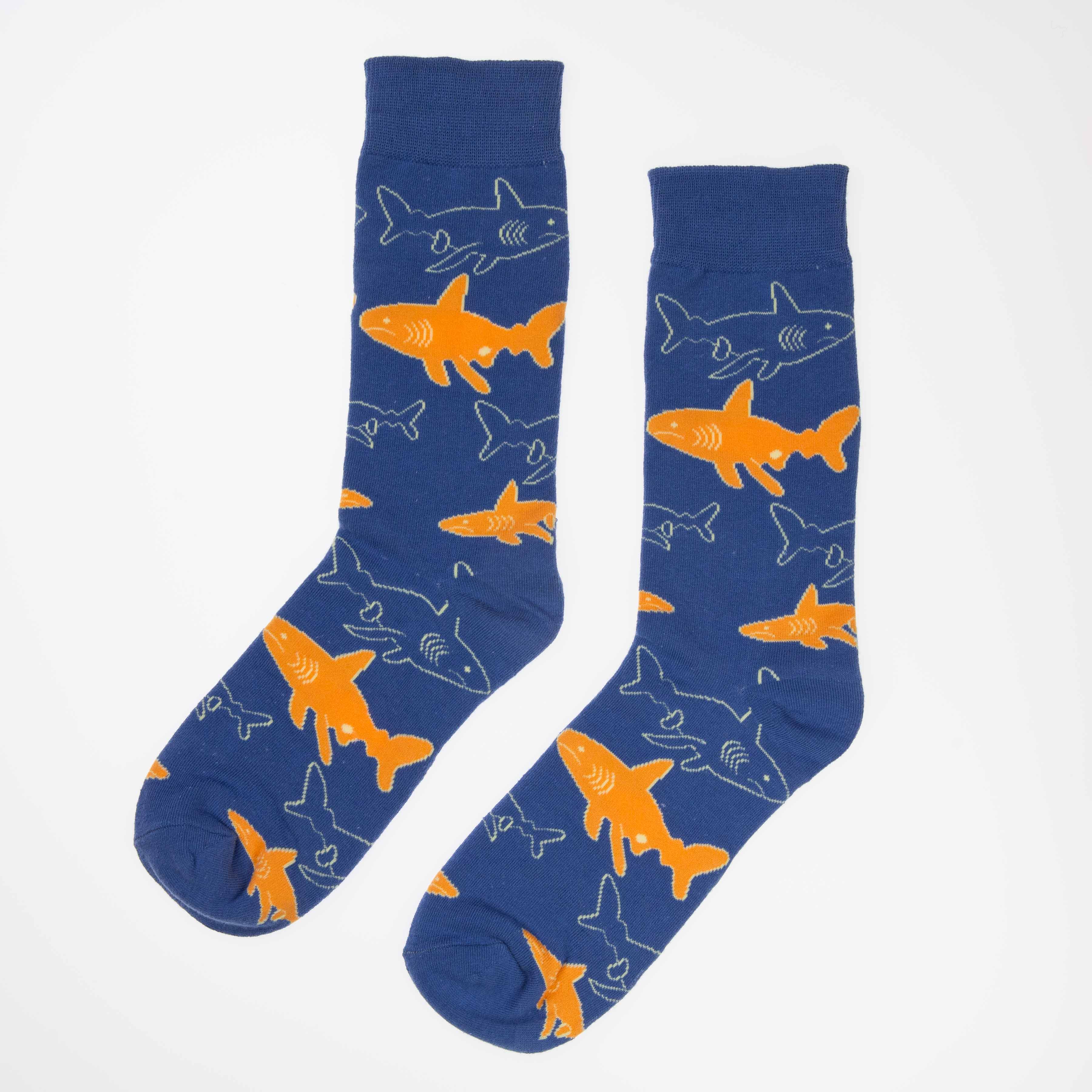 Blå sokker med motiv av haier. Sokkene er myke og behagelige, og passer til enhver anledning.