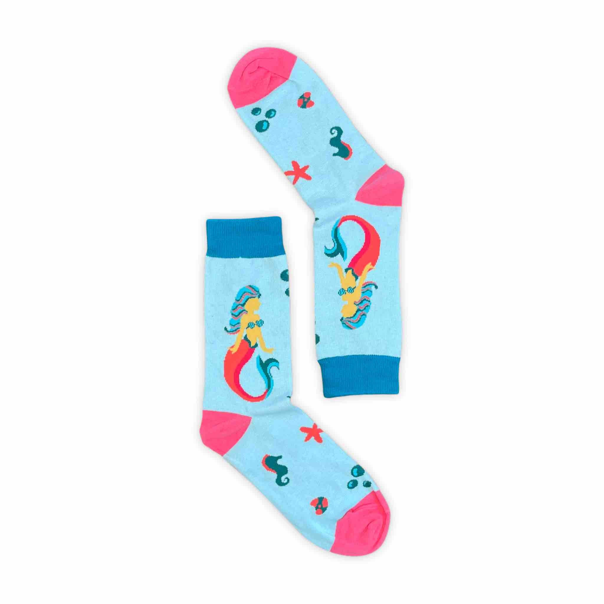 Blå og rosa sokker med motiv av en havfrue. Sokkene er myke og behagelige, og passer til enhver anledning.