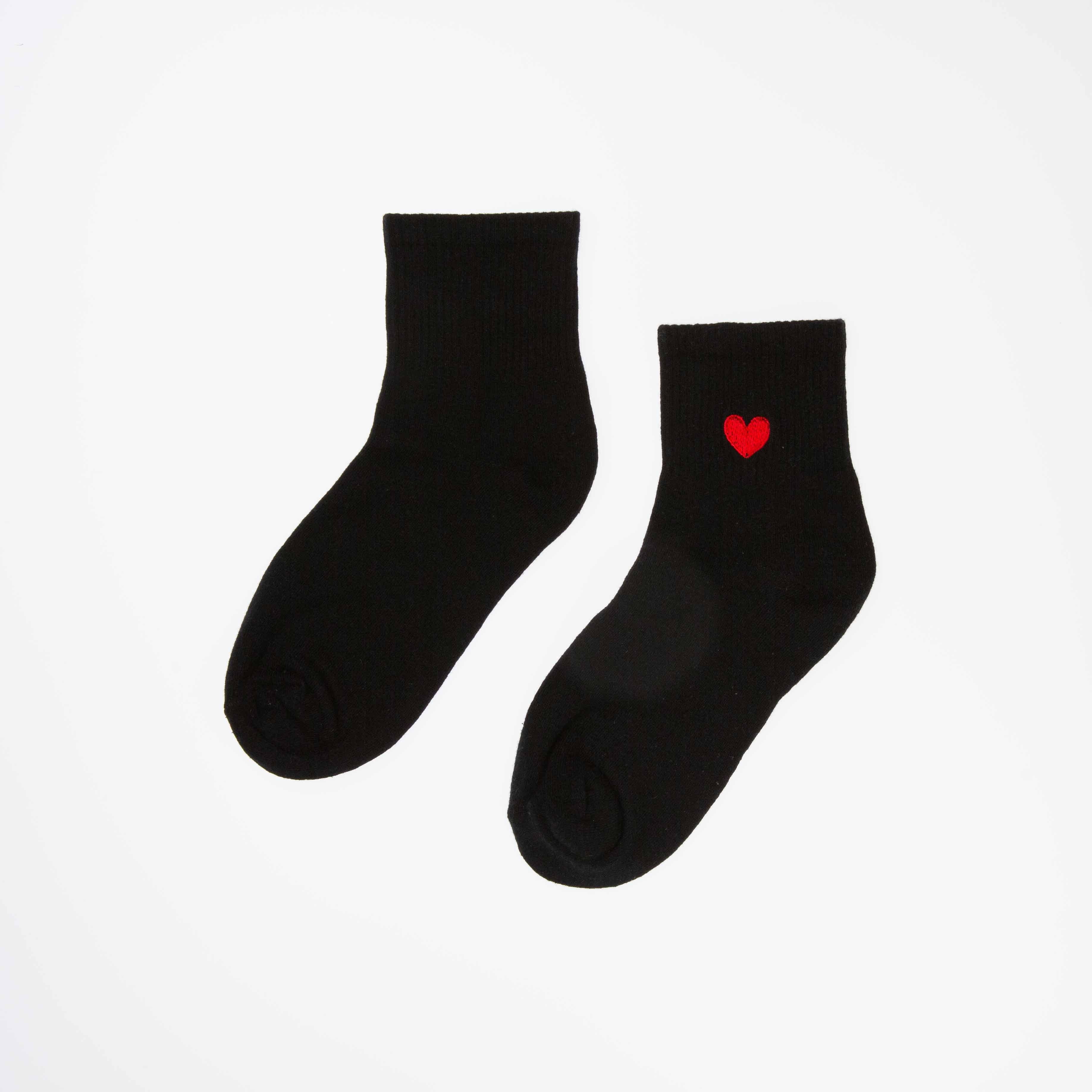 Svarte sokker med motiv av et hjerte. Sokkene er myke og behagelige, og passer til enhver anledning.
