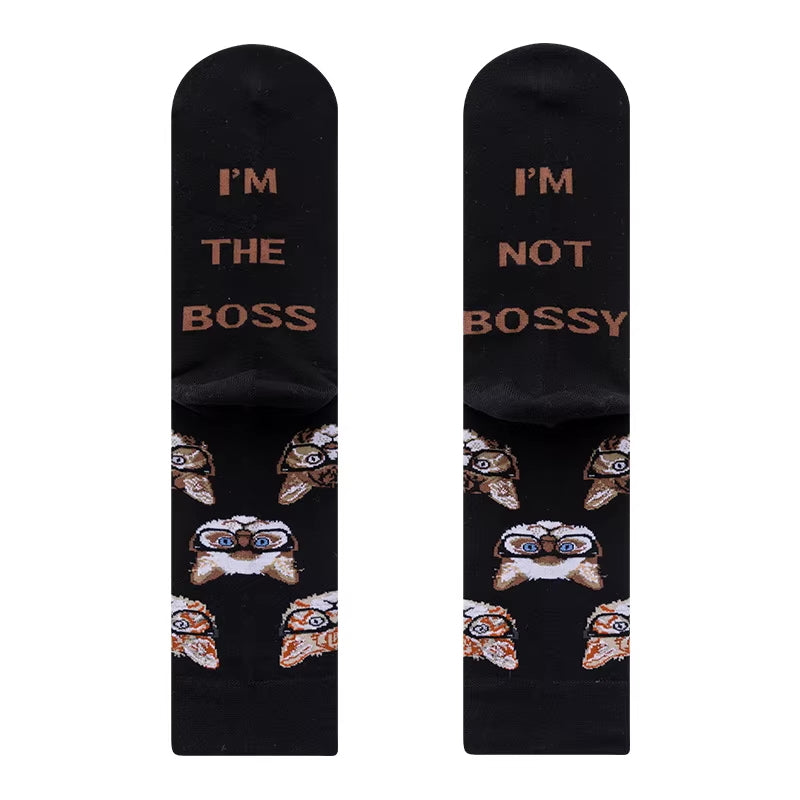 Disse sokkene sier det som det er - uten å måtte si et ord. Under føttene står det "I’m not bossy" og "I’m the boss", og oppover sokken er det kule katter med briller.