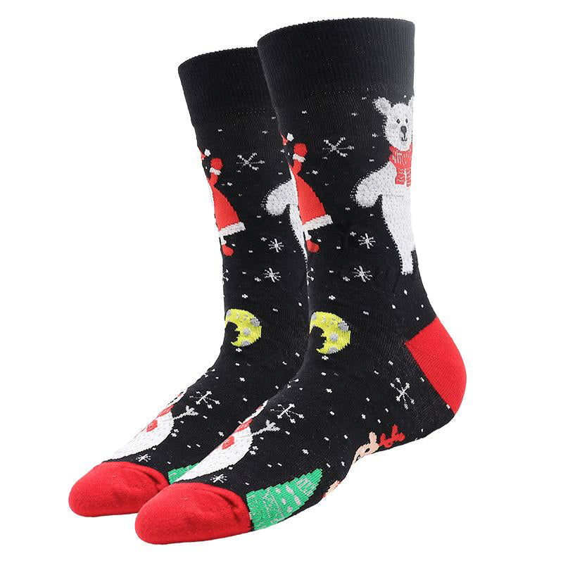 Svarte sokker med motiv av julenisse, snømann og isbjørn. Sokkene er myke og behagelige, og passer til enhver anledning.