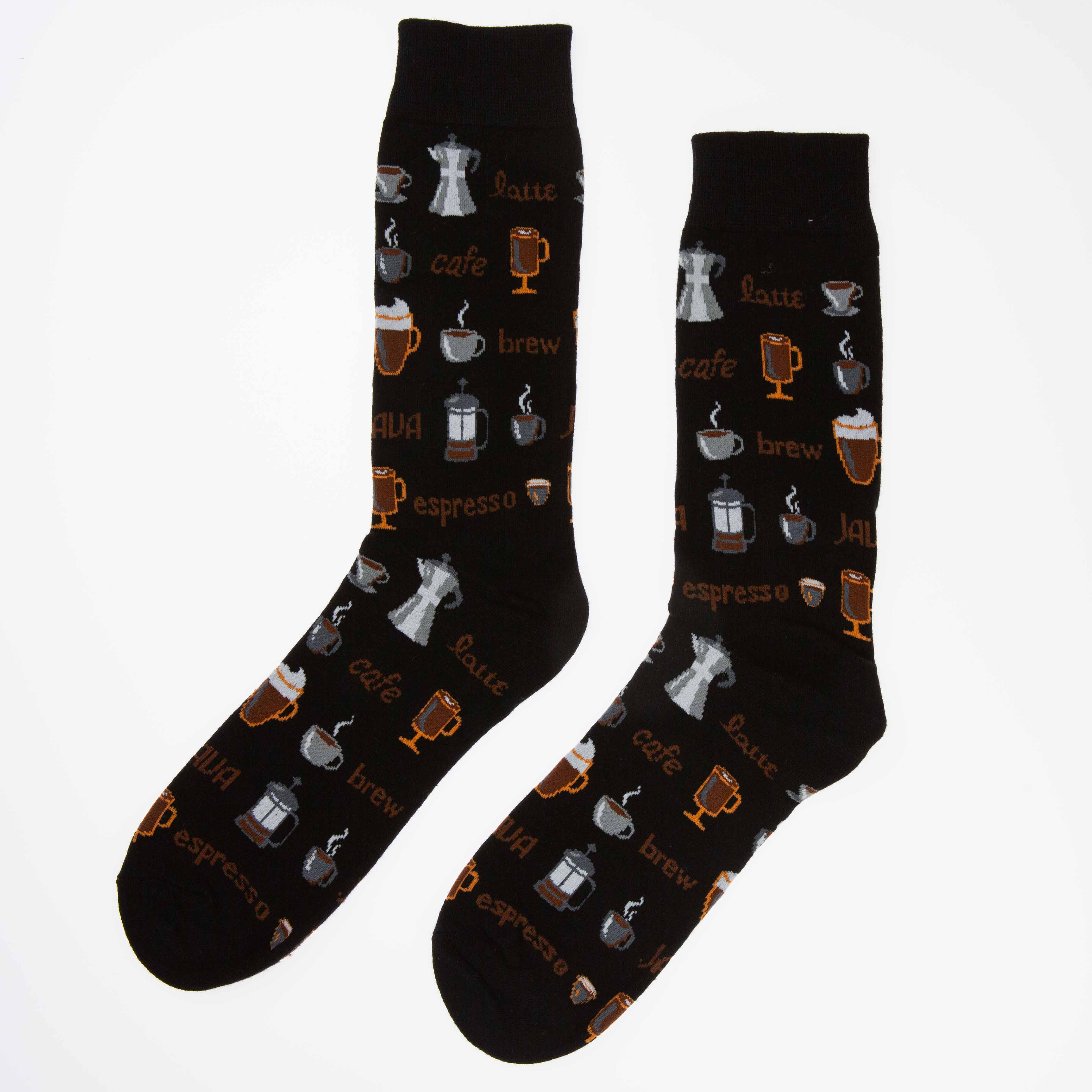 Svarte sokker med motiv av ulike typer kaffe. Sokkene er myke og behagelige, og passer til enhver anledning.
