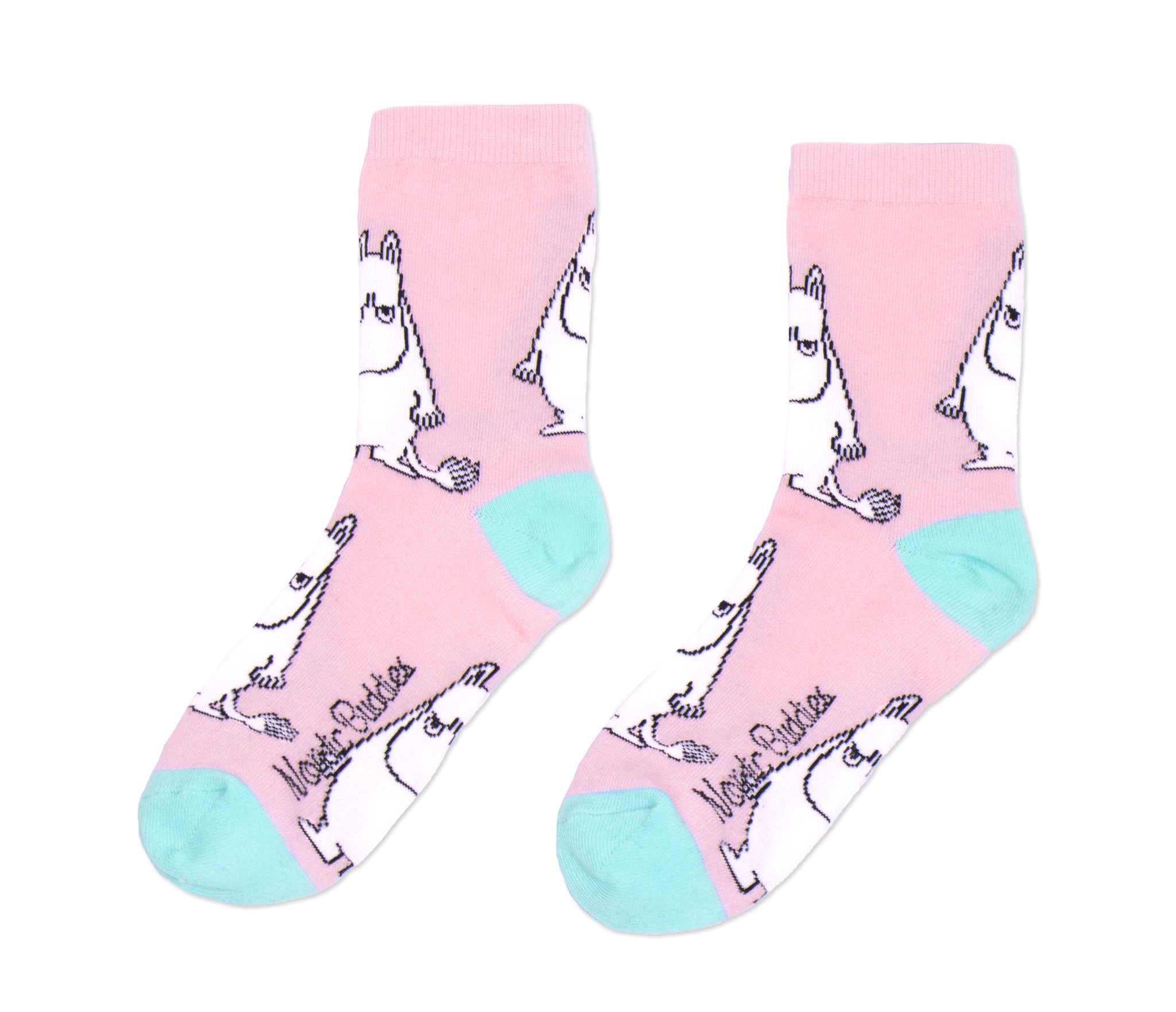Rosa sokker med motiv av Mummitrollet. Sokkene har turkise detaljer på tuppen og på hælen. Fordi de er laget av et mykt materiale, er de både behagelige å ha på seg og et morsomt tillegg til enhver Moomin-fans garderobe. Et offisielt produkt fra Nordic Buddies – ideelle for alle som elsker Moomin-universet.