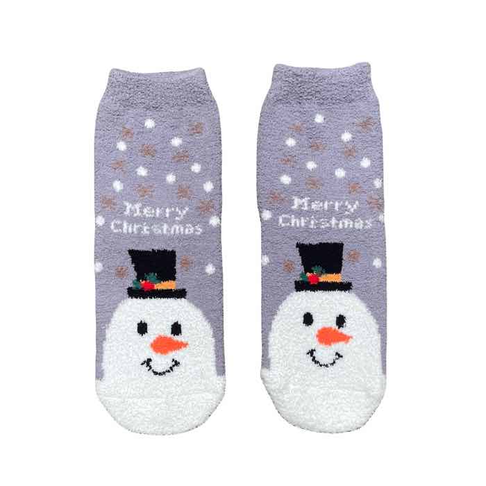 Lysegrå sokker med motiv av en snømann og med teksten "Merry Christmas". Sokkene er i et deilig og mykt stoff, som gjør dem perfekte som kosesokker! Denne snømannen er søt og koselig, og han vet hvordan han får føttene dine til å føle seg som om de har blitt pakket inn i et deilig, mykt teppe.