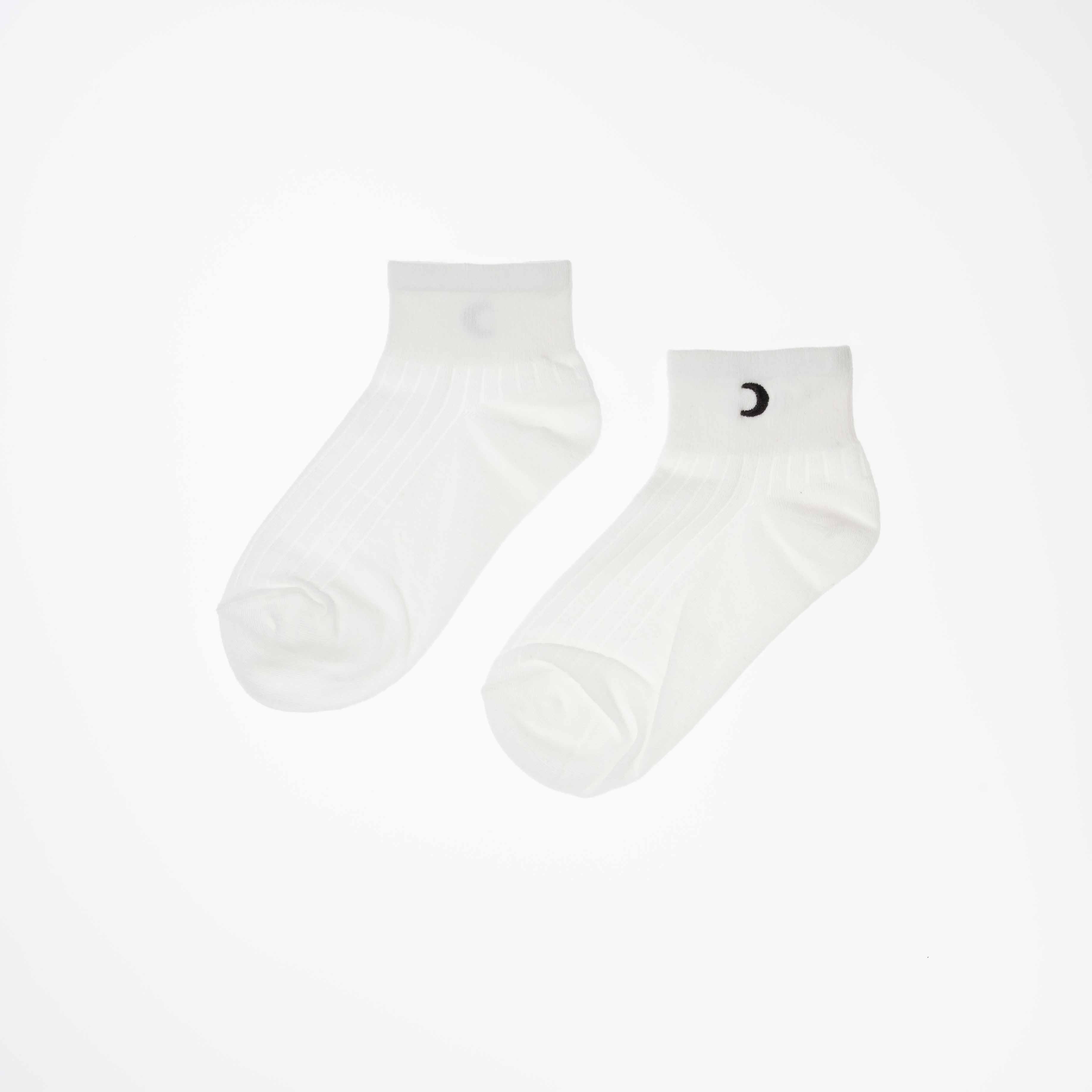 Hvite sokker med motiv av en halvmåne. Sokkene er myke og behagelige, og passer til enhver anledning.