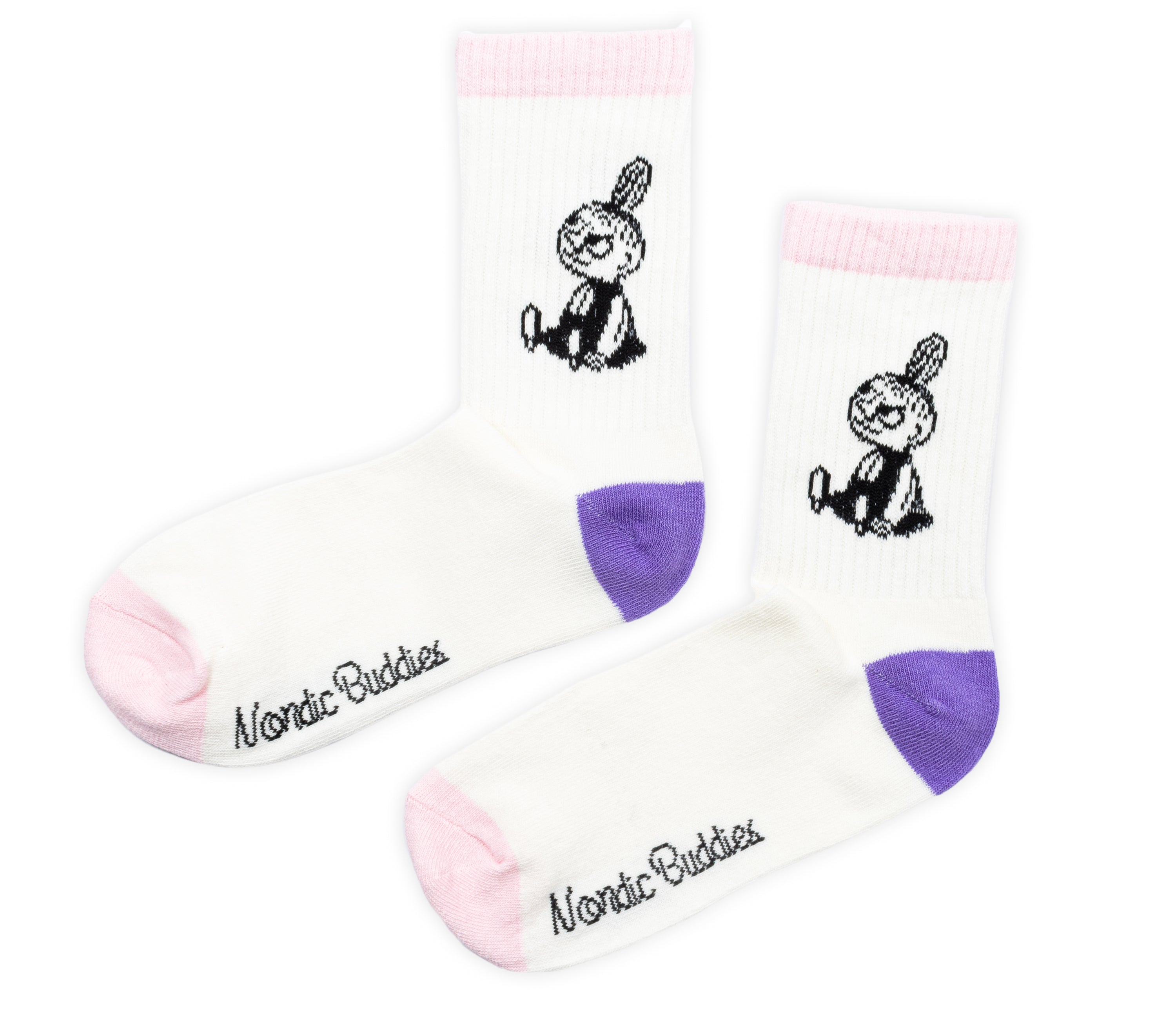 Hvite sokker med motiv av Lille My. Sokkene har lyserosa detaljer på tuppen og øverst på sokken, og lilla på hælen. Fordi de er laget av et mykt materiale, er de både behagelige å ha på seg og et morsomt tillegg til enhver Moomin-fans garderobe. Et offisielt produkt fra Nordic Buddies – ideelle for alle som elsker Moomin-universet.