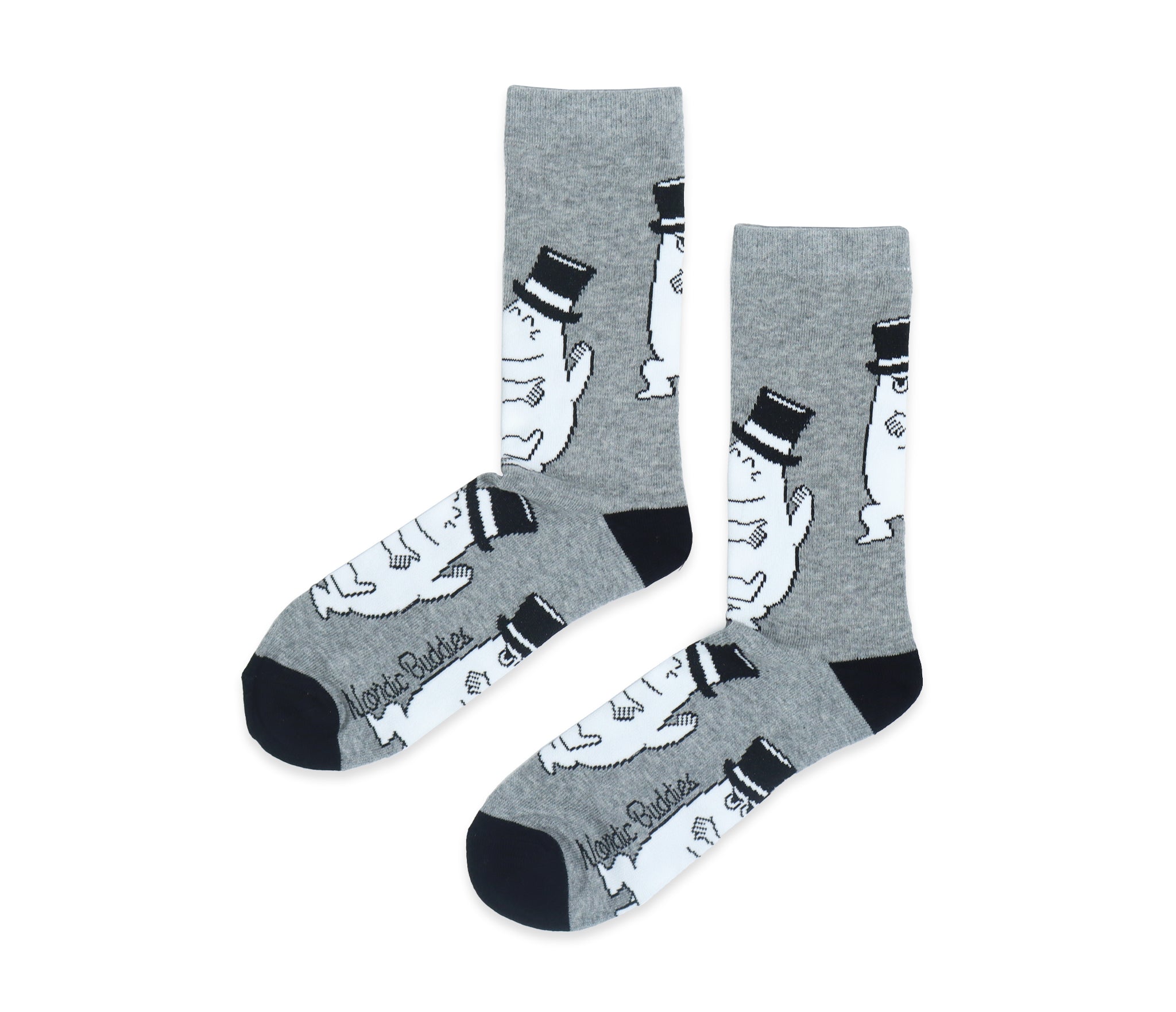 Grå sokker med motiv av Mummipappa. Sokkene har svarte detaljer på tuppen og på hælen. Fordi de er laget av et mykt materiale, er de både behagelige å ha på seg og et morsomt tillegg til enhver Moomin-fans garderobe. Et offisielt produkt fra Nordic Buddies – ideelle for alle som elsker Moomin-universet.