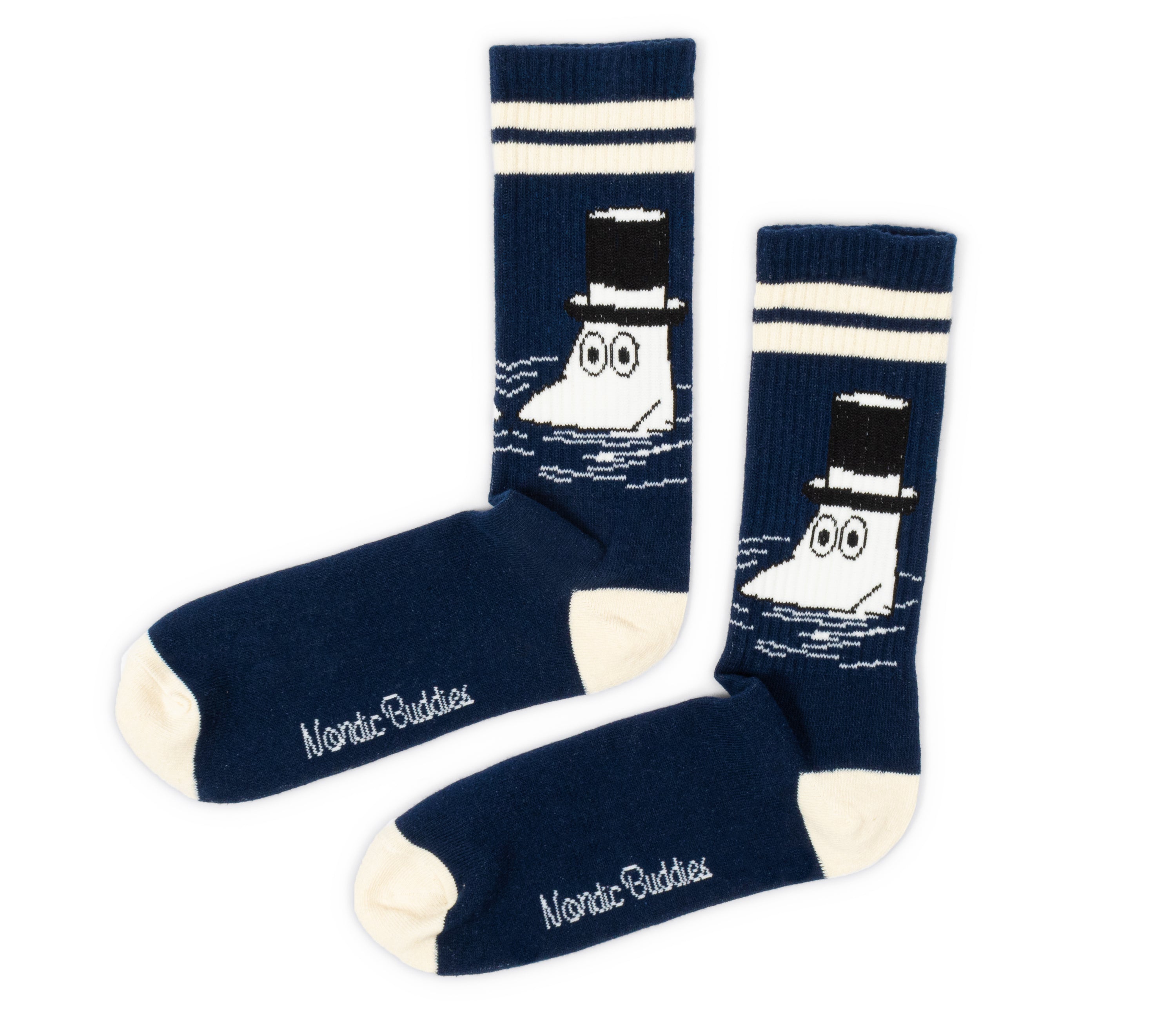 Mørkeblå sokker med motiv av Mummipappa. Sokkene har hvite detaljer på tuppen og på hælen, og to hvite striper øverst på sokken. Fordi de er laget av et mykt materiale, er de både behagelige å ha på seg og et morsomt tillegg til enhver Moomin-fans garderobe. Et offisielt produkt fra Nordic Buddies – ideelle for alle som elsker Moomin-universet.