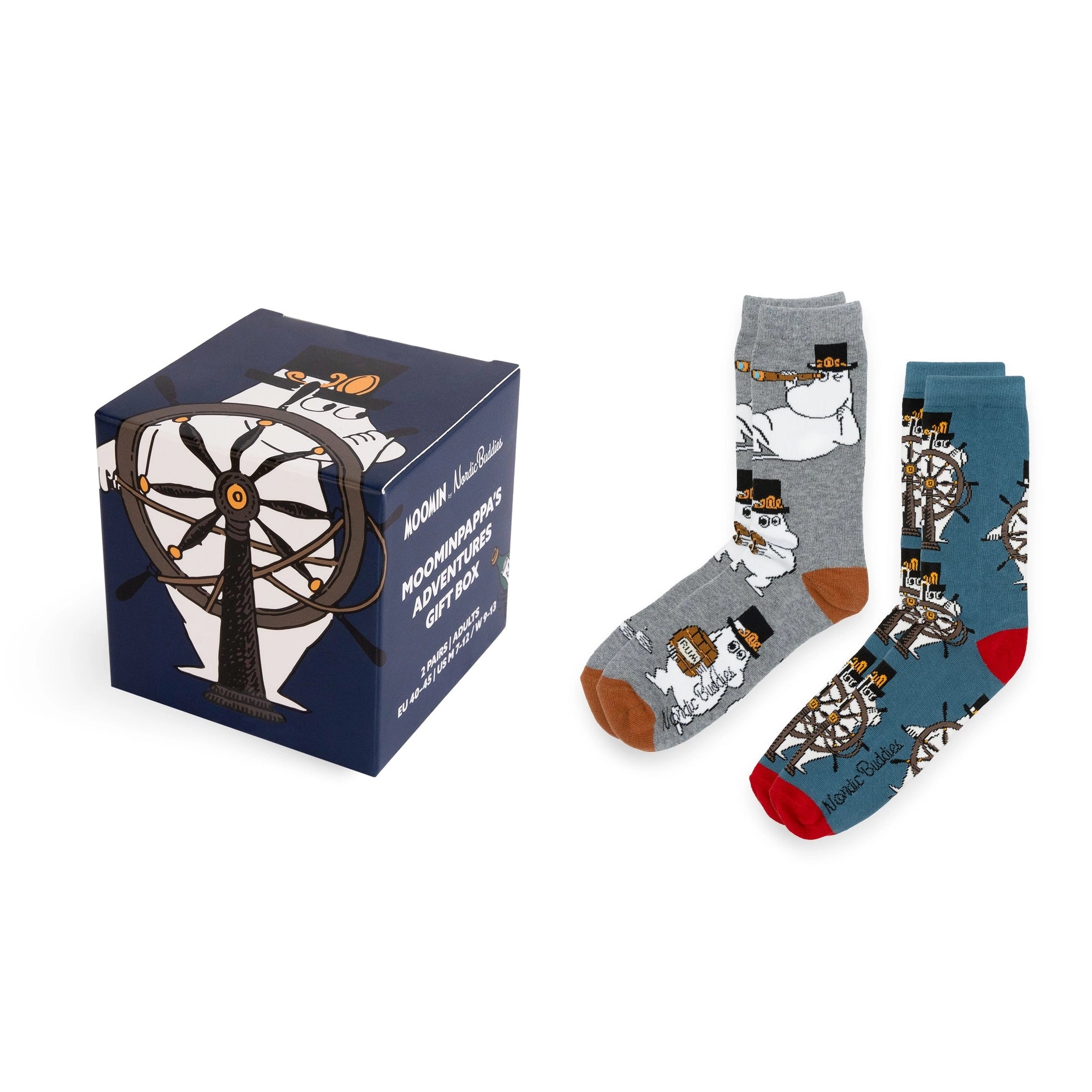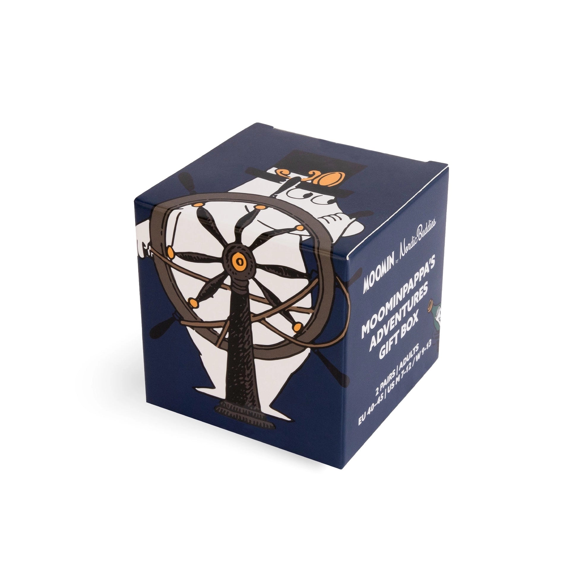 Boksen inneholder to par sokker fulle av sjøsprøyt, skipsratt og Mummipappa i sin ikoniske flosshatt. Fargene er dype, lune og perfekte for både sofadager og dine egne små ekspedisjoner ut i verden.