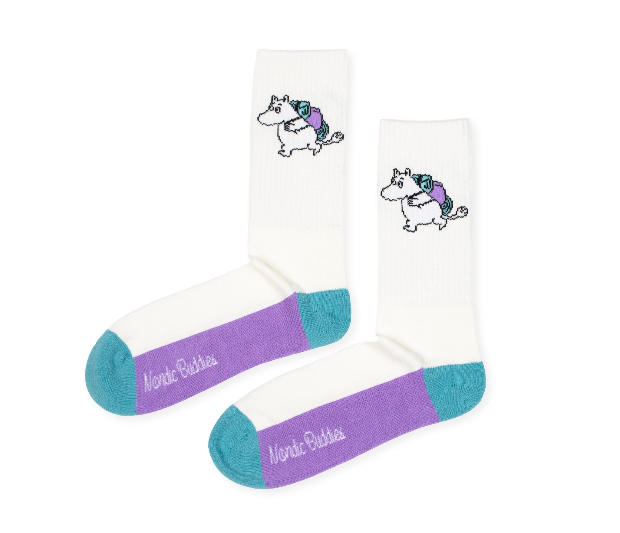Hvite sokker med motiv av Mummitrollet. Sokkene har grønne detaljer på tuppen og på hælen, og lilla under fotsålen. Fordi de er laget av et mykt materiale, er de både behagelige å ha på seg og et morsomt tillegg til enhver Moomin-fans garderobe. Et offisielt produkt fra Nordic Buddies – ideelle for alle som elsker Moomin-universet.