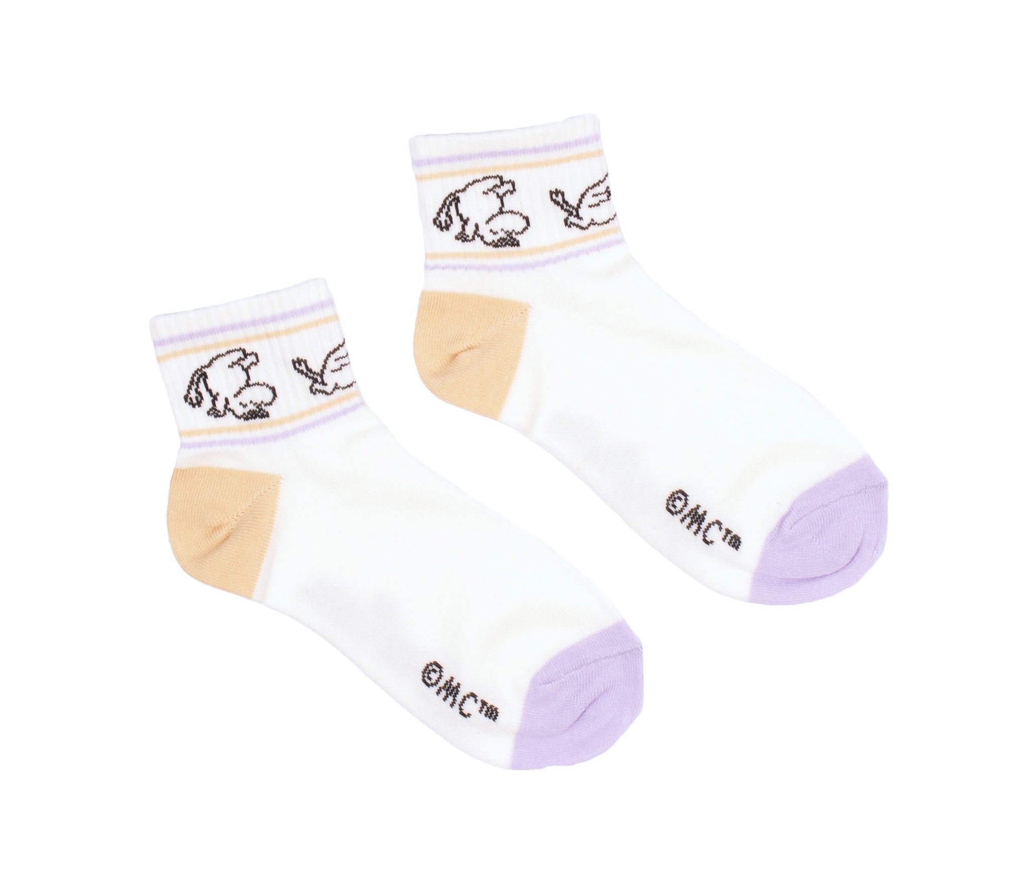 Hvite retro ankelsokker med motiv av Mummitrollet. Sokkene har lilla detalj på tuppen, beige detalj på hælen, og to lilla og to beige striper øverst på sokken. Fordi de er laget av et mykt materiale, er de både behagelige å ha på seg og et morsomt tillegg til enhver Moomin-fans garderobe. Et offisielt produkt fra Nordic Buddies – ideelle for alle som elsker Moomin-universet.