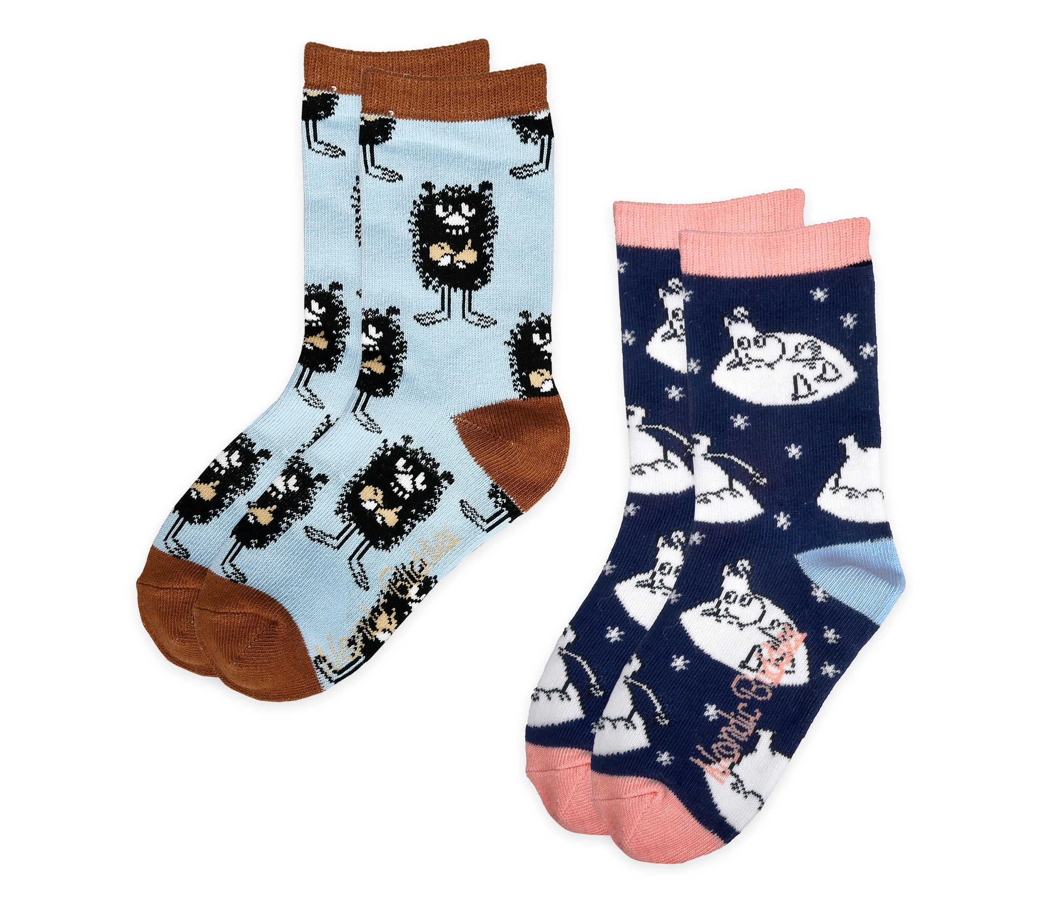 Barnesokkene selges i 2pk, hvor det i hver pakke er to forskjellige par. Det ene paret er lyseblå sokker med motiv av Stinky, med brune detaljer på tuppen og på hælen. Det andre paret er mørkeblå sokker med motiv av Mummitrollet, med rosa detaljer på tuppen og lyseblå på hælen.