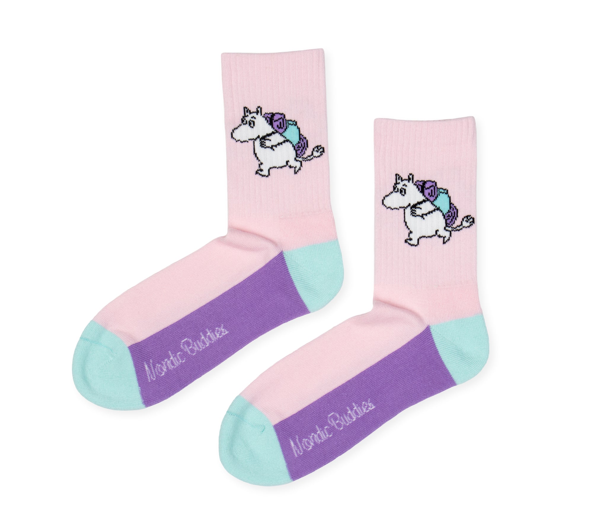 Lyserosa sokker med motiv av Mummitrollet på eventyr. Sokkene har lyseblå detaljer på tuppen og på hælen, og lilla under fotsålen. Fordi de er laget av et mykt materiale, er de både behagelige å ha på seg og et morsomt tillegg til enhver Moomin-fans garderobe. Et offisielt produkt fra Nordic Buddies – ideelle for alle som elsker Moomin-universet.