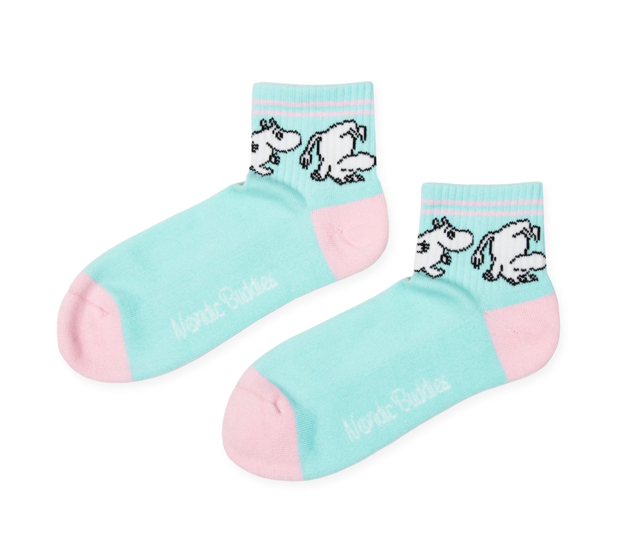 Turkise retro ankelsokker med motiv av Mummiotrollet . Sokkene har rosa detaljer på tuppen, hælen, og toppen av sokken. Fordi de er laget av et mykt materiale, er de både behagelige å ha på seg og et morsomt tillegg til enhver Moomin-fans garderobe. Et offisielt produkt fra Nordic Buddies – ideelle for alle som elsker Moomin-universet.