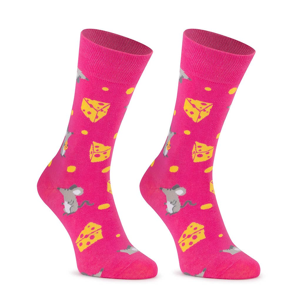 Disse sokkene er rett og slett ostete - på den søteste måten! Med en liten mus som koser seg blant ostebiter på rosa bakgrunn, får du et lekent og sjarmerende par sokker som garantert får folk til å smile. Perfekt for deg som liker litt humor i antrekket.