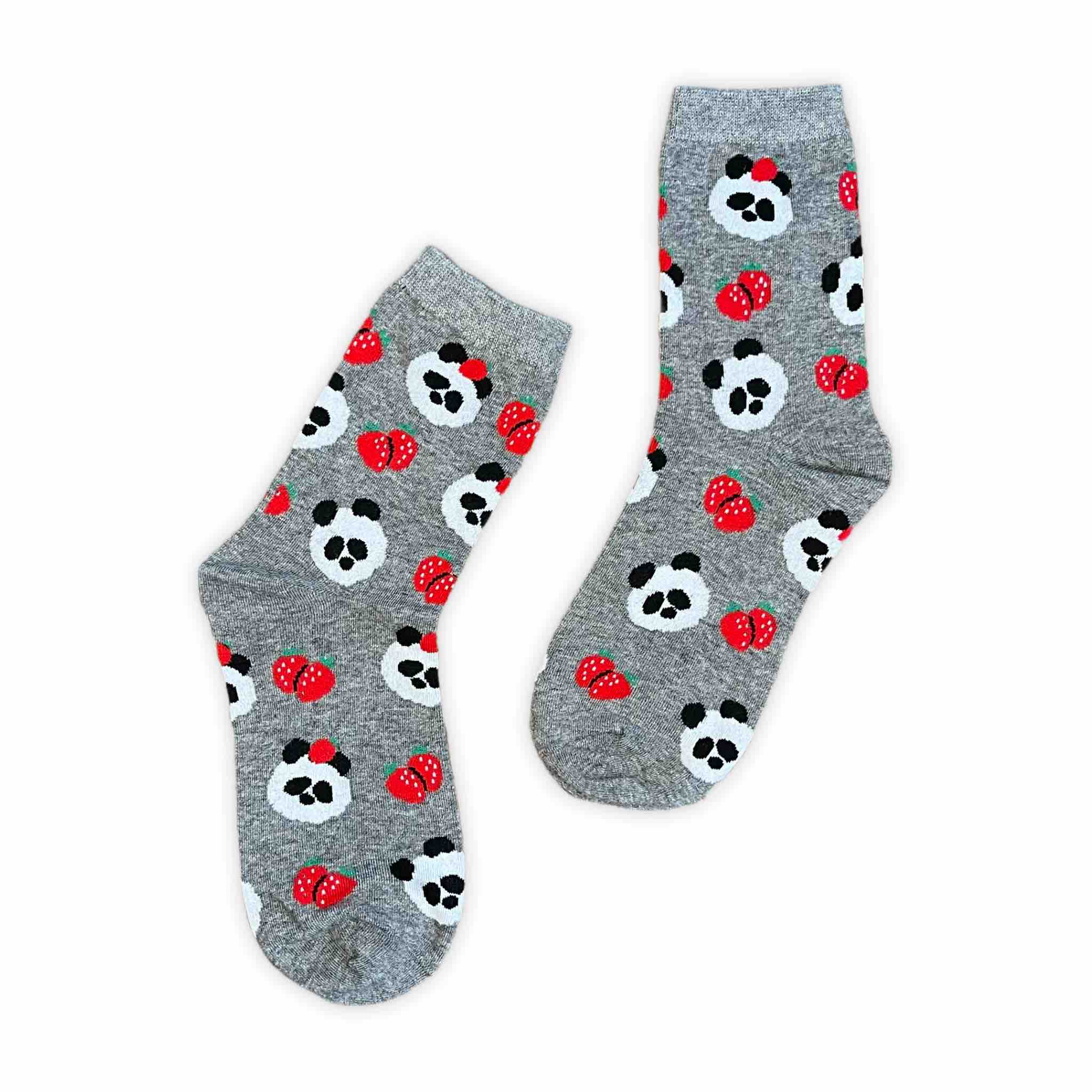 Grå sokker med motiv av panda og jordbær. Sokkene er myke og behagelige, og passer til enhver anledning.