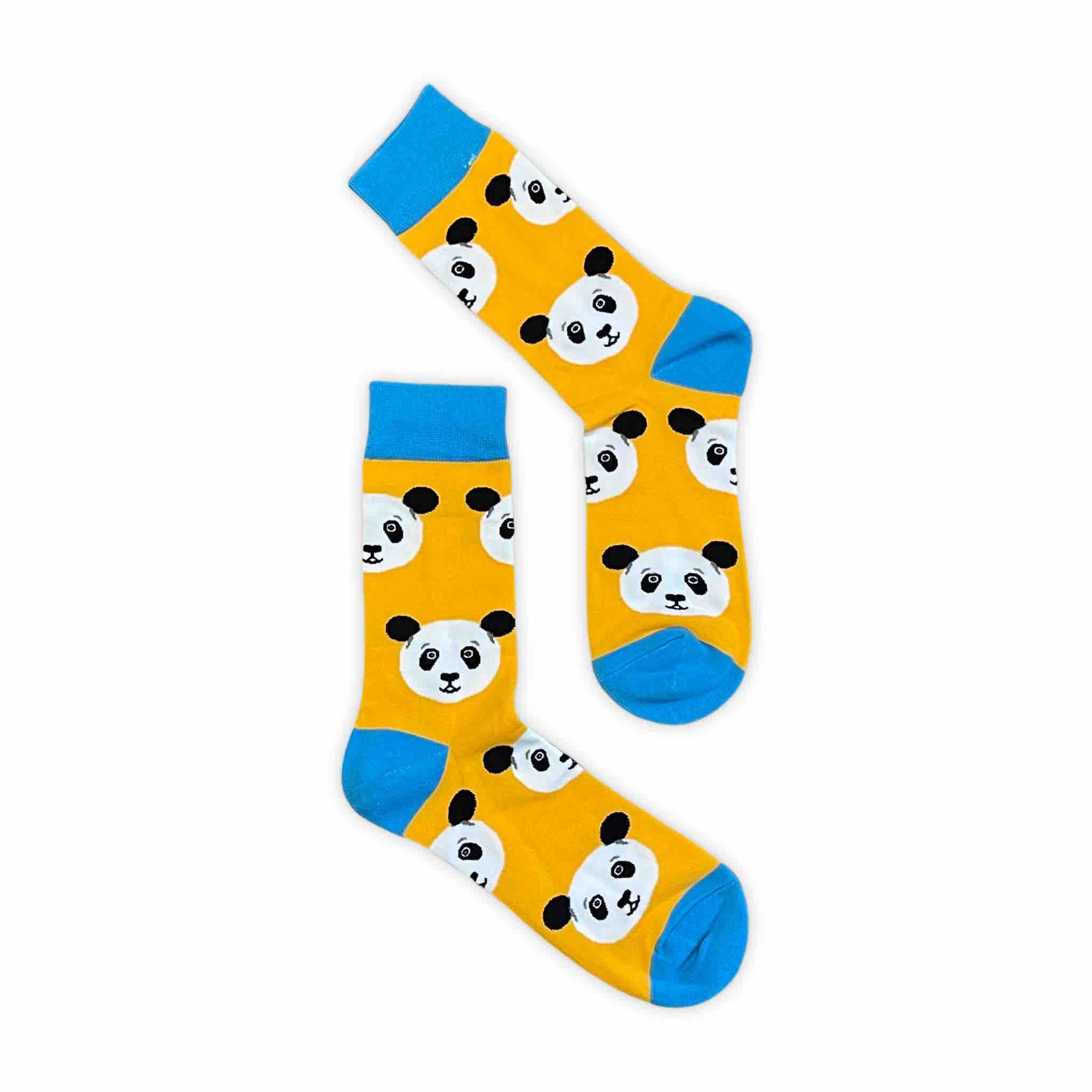 Gule og blå sokker med motiv av panda. Sokkene er myke og behagelige, og passer til enhver anledning.