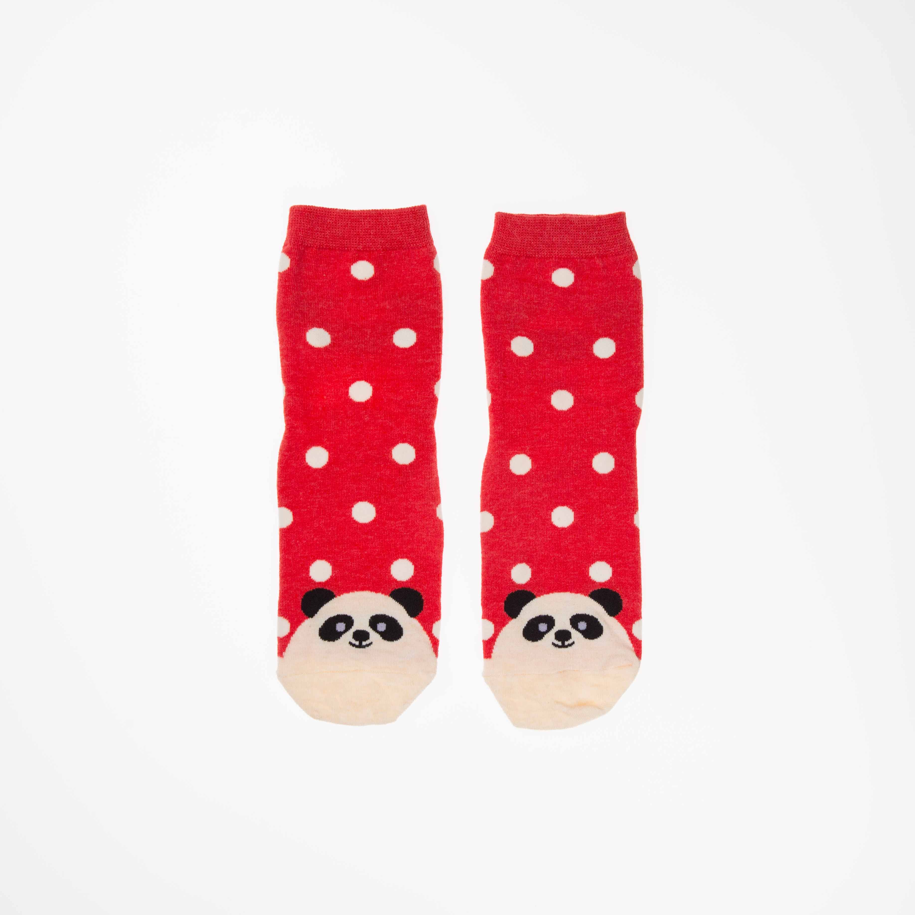 Rød sokker med motiv av en panda. Sokkene er myke og behagelige, og passer til enhver anledning.