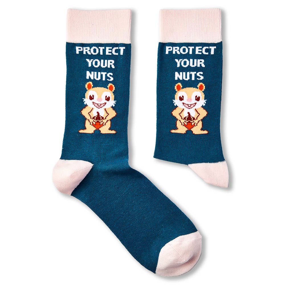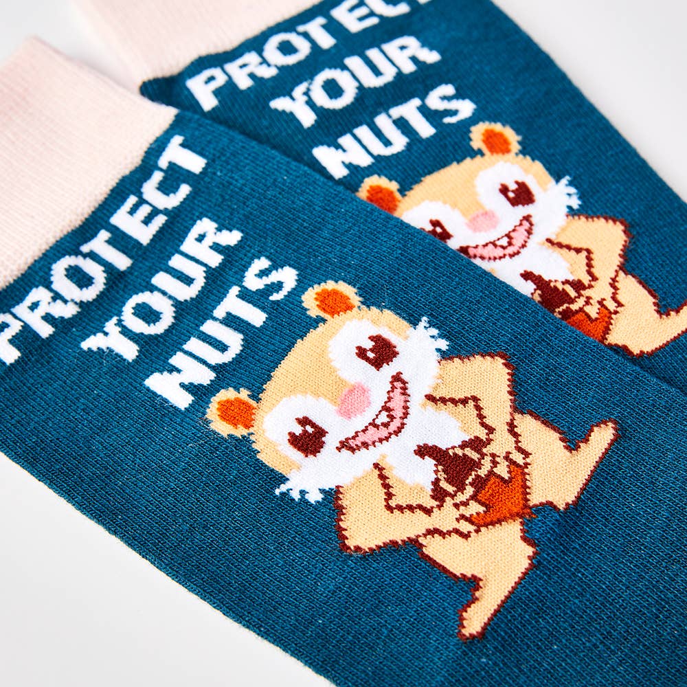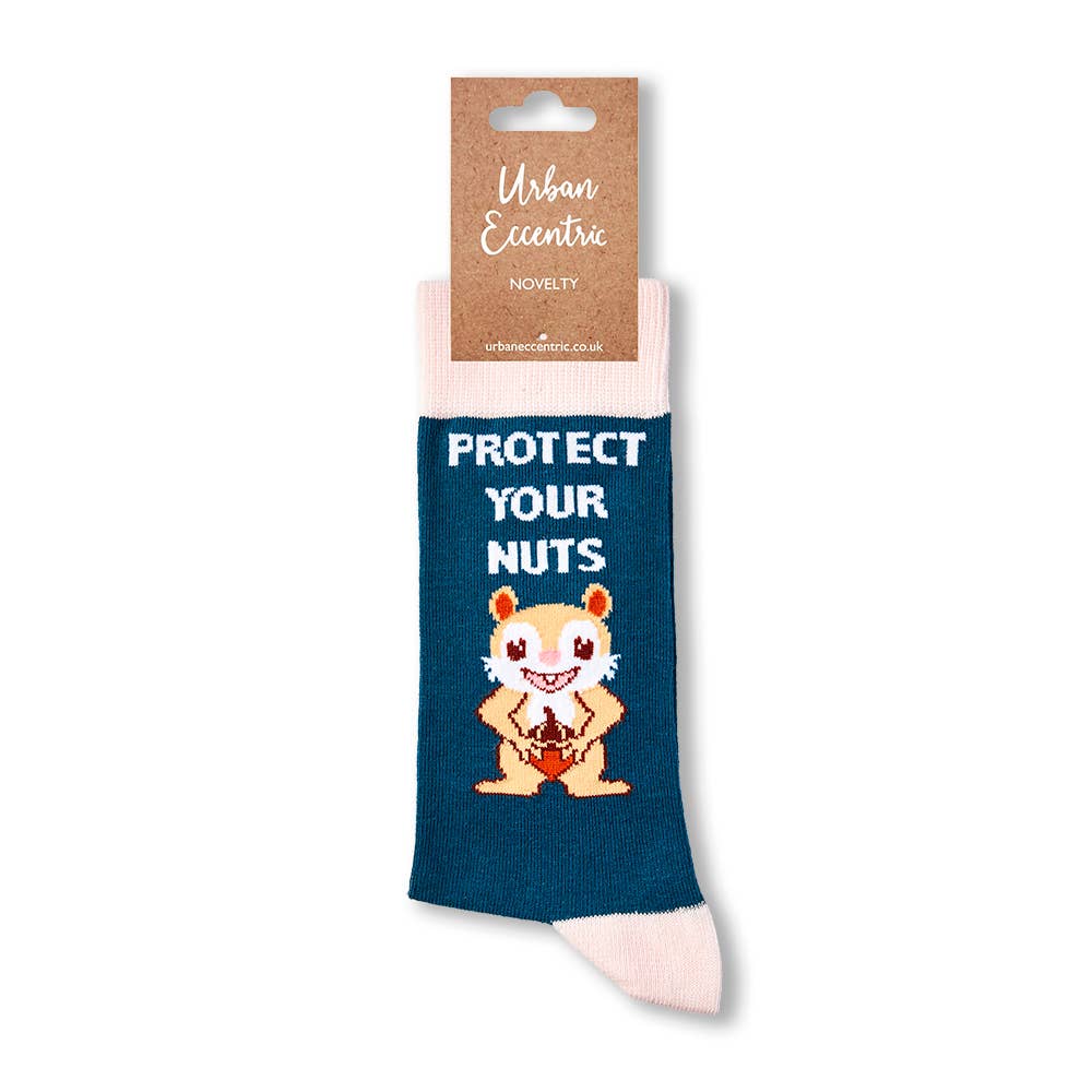 Si hei til en sokk som tør å skille seg ut – bokstavelig talt. Disse sokkene fra Urban Eccentric har et motiv av et ekorn som holder en nøtt og en tekst som får deg til å trekke på smilebåndet. De er grønnblå med lyserosa detaljer øverst på kanten, på hælen og ytterst på sokken.