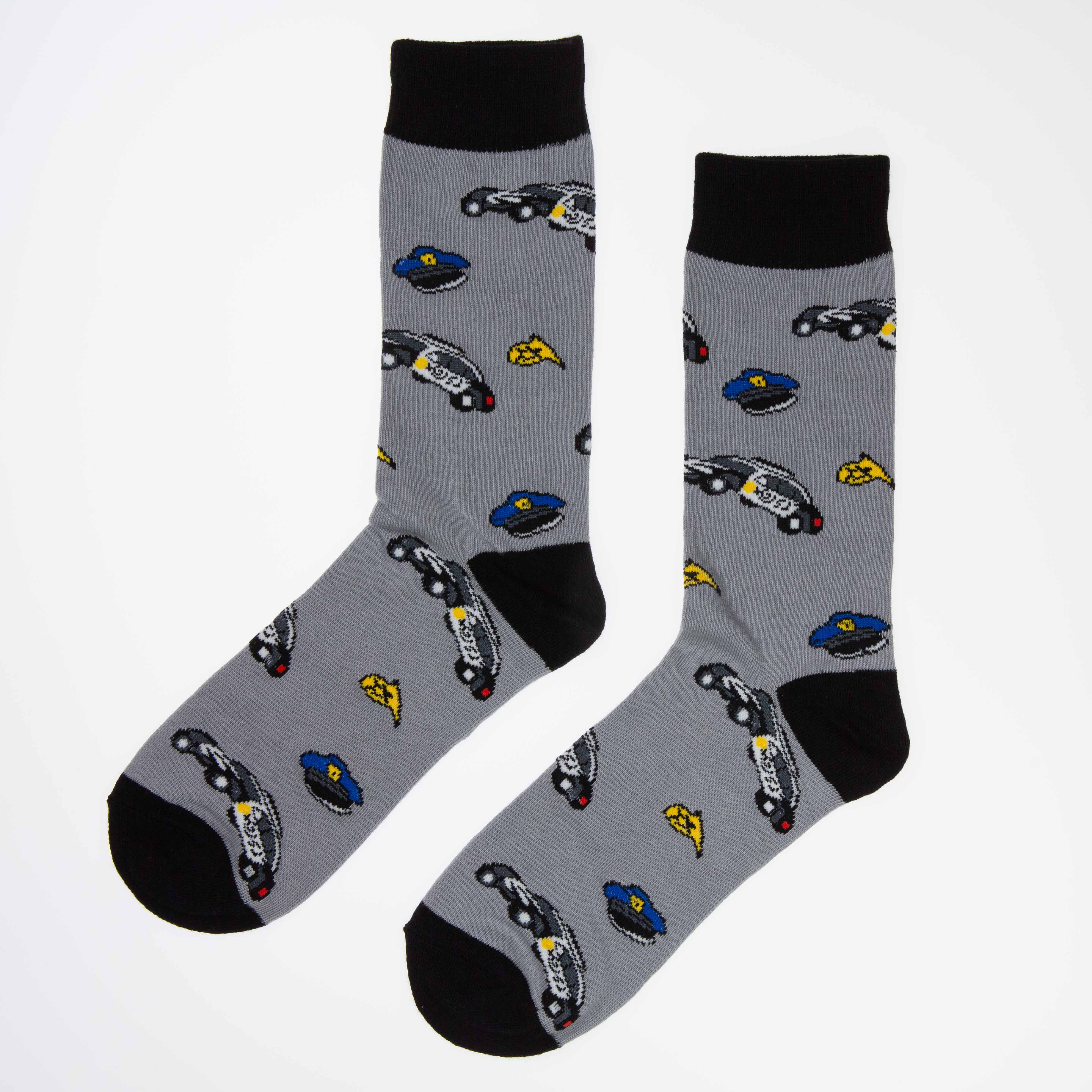 Grå sokker med motiv som ligner en politibil og lue. Sokkene er myke og behagelige, og passer til enhver anledning.