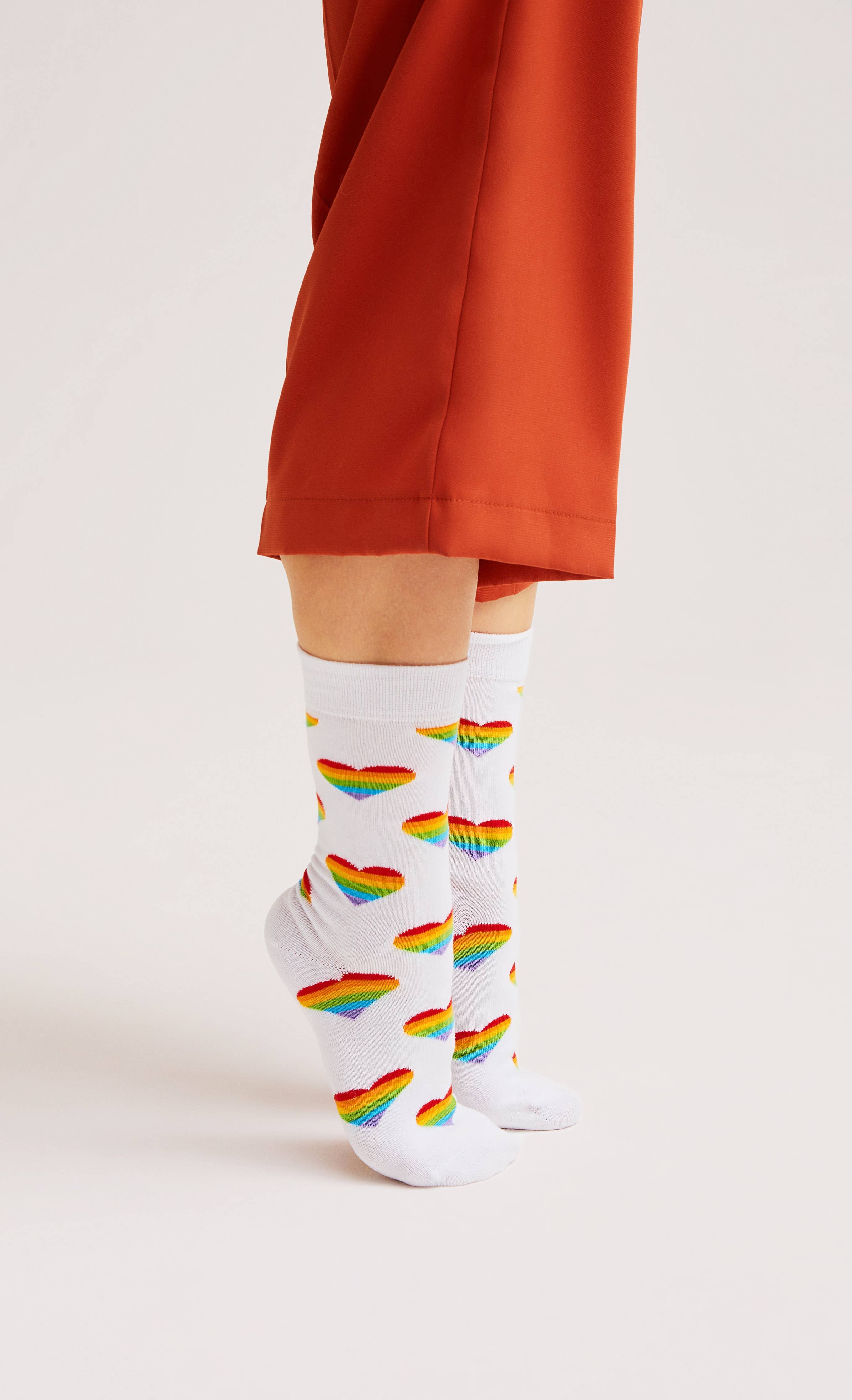 Natural Vibes crew-sokker i myk, økologisk bomull har et hjerte for både komfort og kjærlighet. De hvite sokkene er dekorert med små regnbuehjerter – perfekte til Pride-paraden, men også like fine til søndagsturen. Et fargerikt og varmt innslag i hverdagen, året rundt.