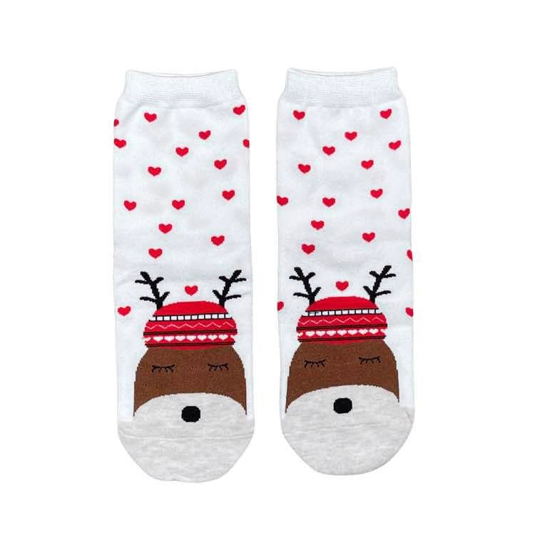 Hvite sokker med motiv av et reinsdyr med lue, og små hjerter rundt. Med disse sokkene får du er herlig blanding av søtt, festlig, og litt søtt igjen! Her trenger du ikke vente på at julenissen skal komme med reinsdyrene sine, for du kan ha dine egne reinsdyr med deg uansett hvor du går.