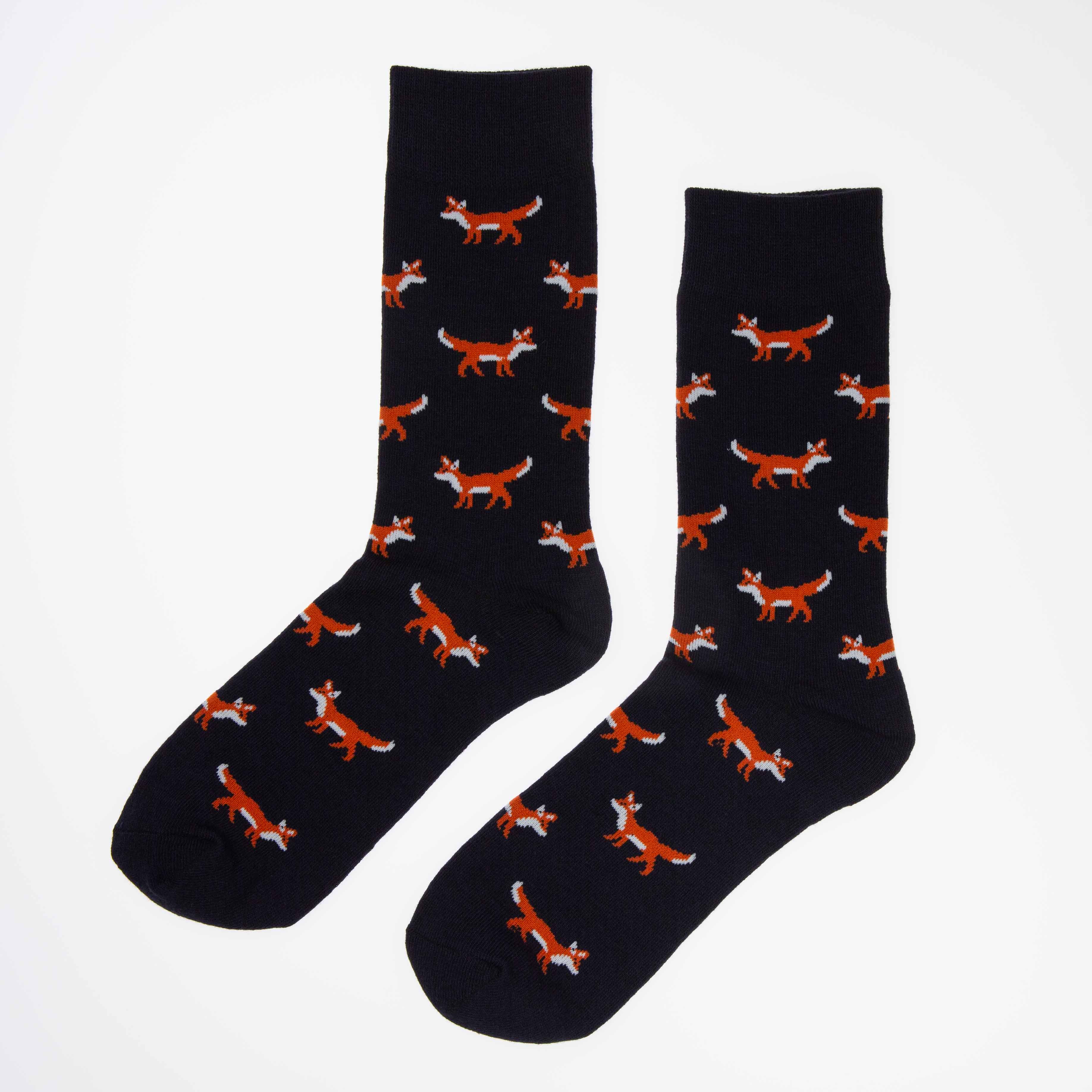 Svarte sokker med motiv av rev. Sokkene er myke og behagelige, og passer til enhver anledning.