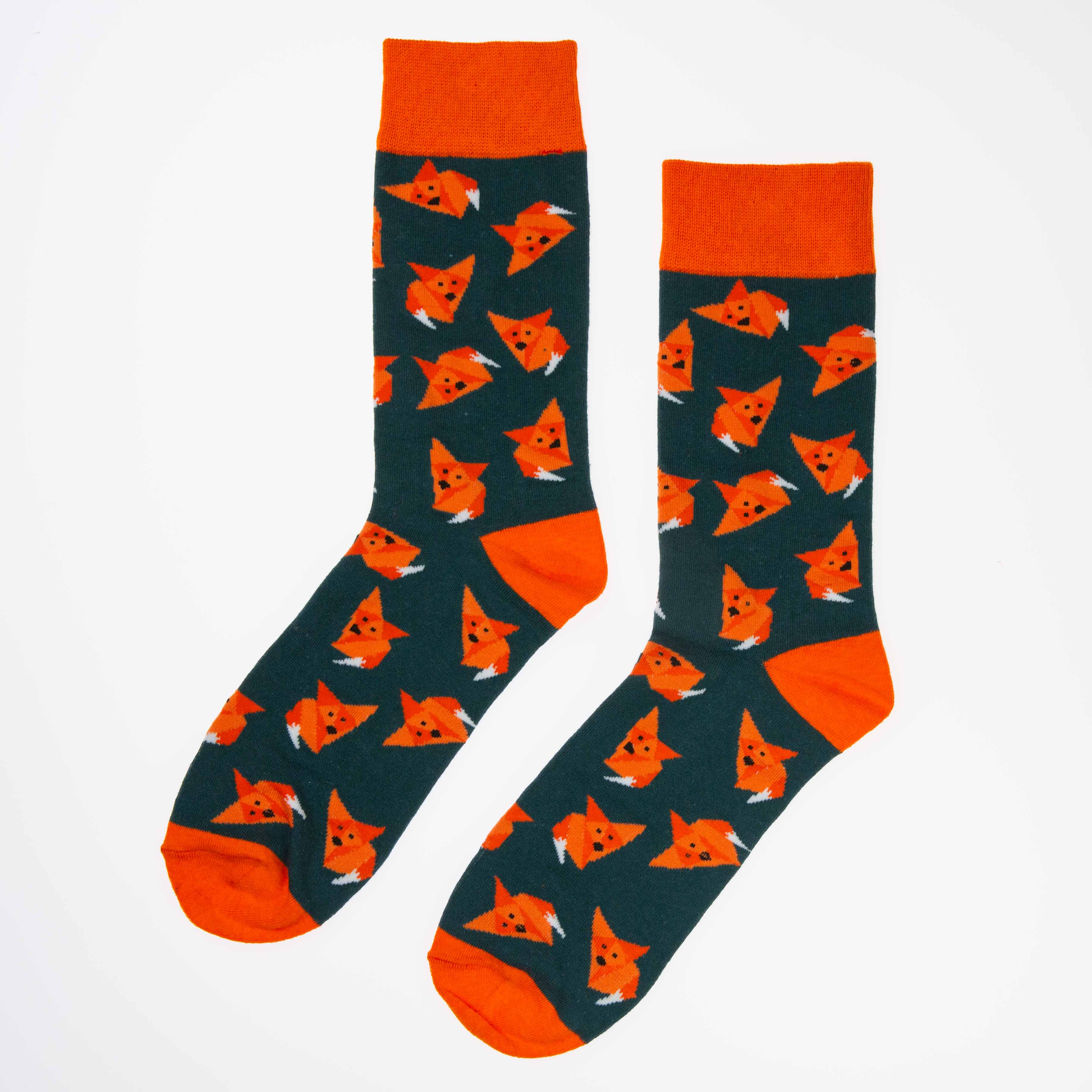 Mørkegrønne og oransje sokker med motiv av rev. Sokkene er myke og behagelige, og passer til enhver anledning.